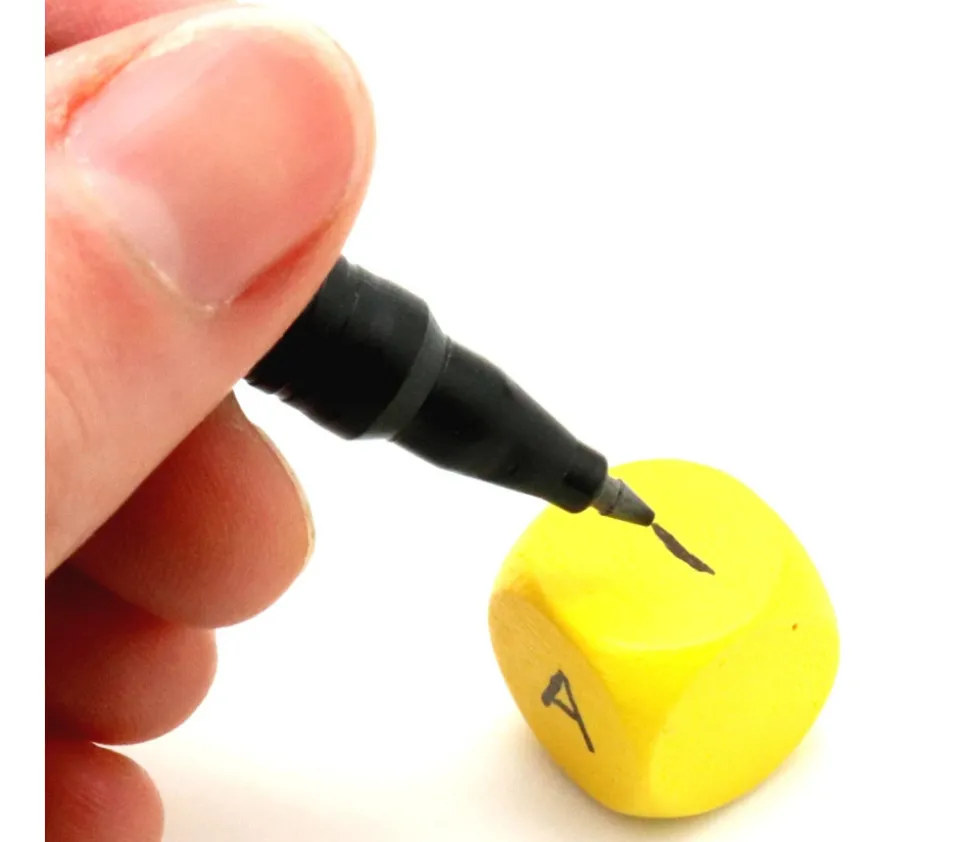 N’oubliez pas de vernir les dés avant de le marquer pour éviter que la peinture ou l’encre ne fuse sur le bois et ensuite pour une meilleure durabilité. Vous pouvez également coller des étiquettes ou des stickers pour personnaliser facilement le dé.