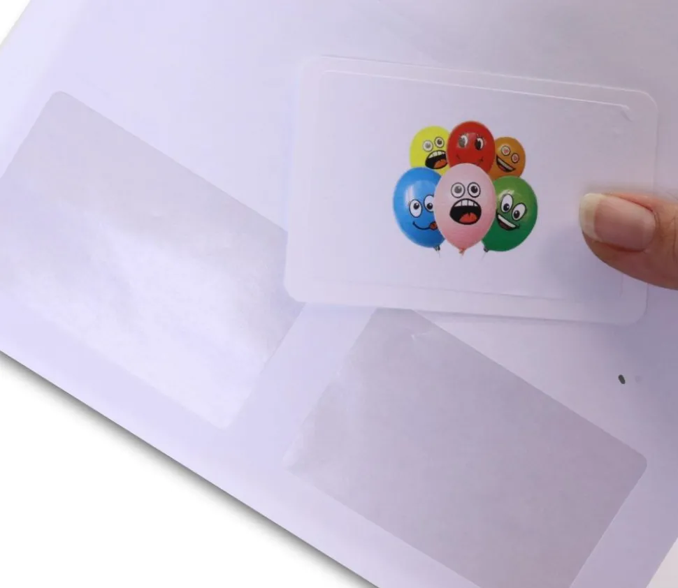 Autocollants rectangles de 80 x 50 mm de coté, blancs pour personnaliser plus facilement vos cartes à jouer. Étiquette adhésive.