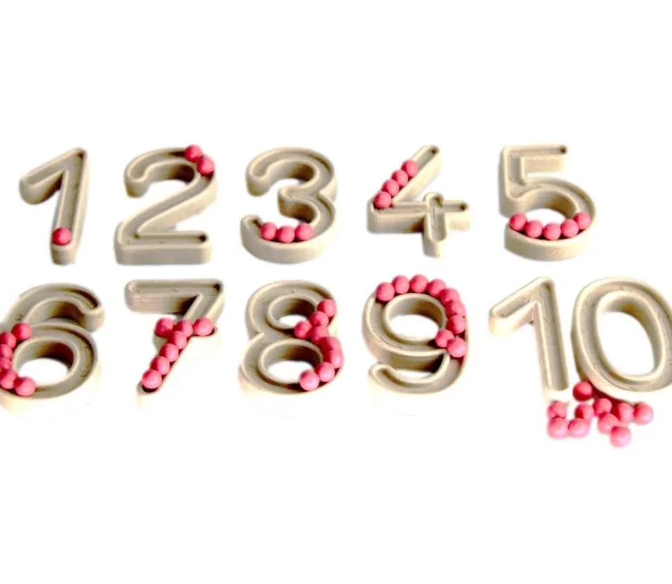 Ensemble de 10 chiffres de 1 à 9 avec goulotte qui permet de positionner des boules rouges pour apprendre à visualiser le chiffre et à remplir la cavité du bon nombre de boules. Idéal pour exercices de mathématique et apprentissage des chiffres.