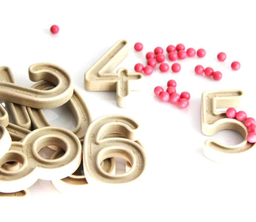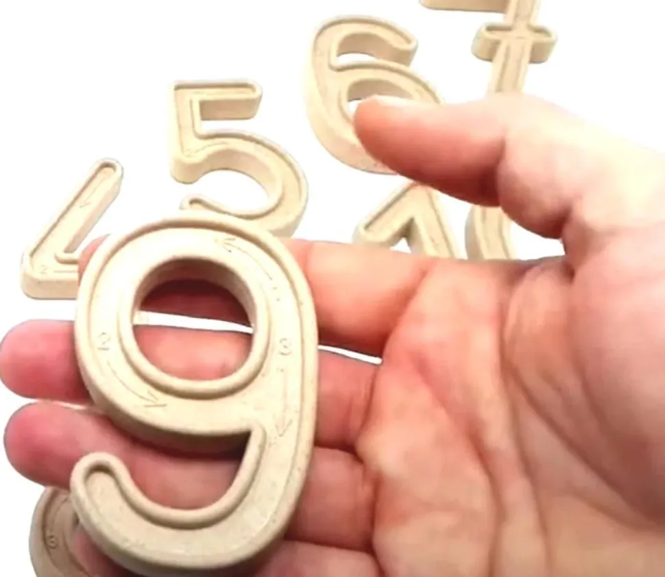 Grands chiffres en REWOOD de 7.5 cm de hauteur pour bien se représenter la forme des chiffres. Ensemble de 10 chiffres de 0 à 9 avec goulotte intérieure et 60 boules rouges pour apprendre à visualiser le chiffre et à remplir la cavité du bon nombre de boules. Idéal pour exercices de mathématique et apprentissage des chiffres.