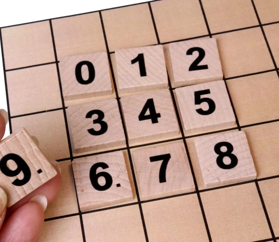 Petites tuiles en bois de forme carré avec une face neutre et l’autre face avec un nombre de 0 à 9, pour jeux de math ou jeux de société. Lot de 10.