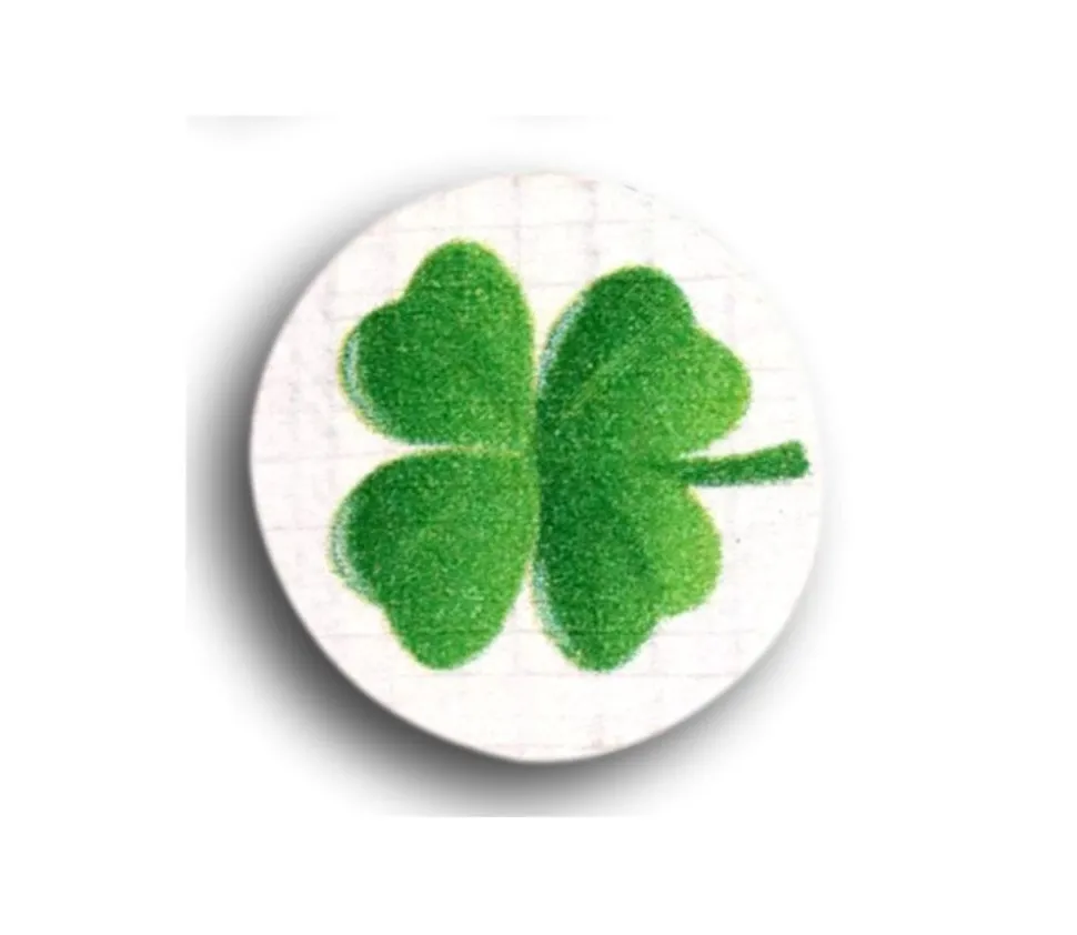 Dimensions 15 mm de diamètre. Trèfle à 4 feuilles vert sur fond blanc, accessoire de jeux,