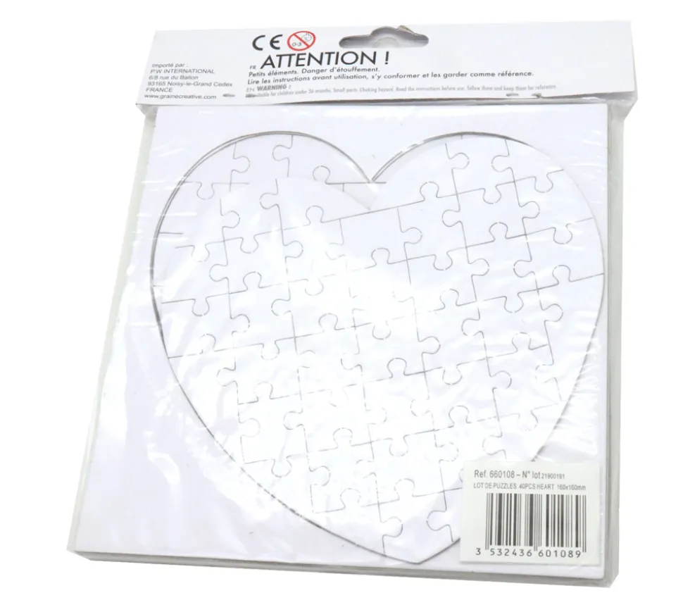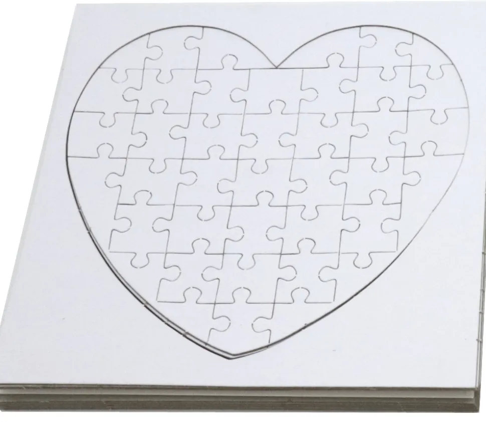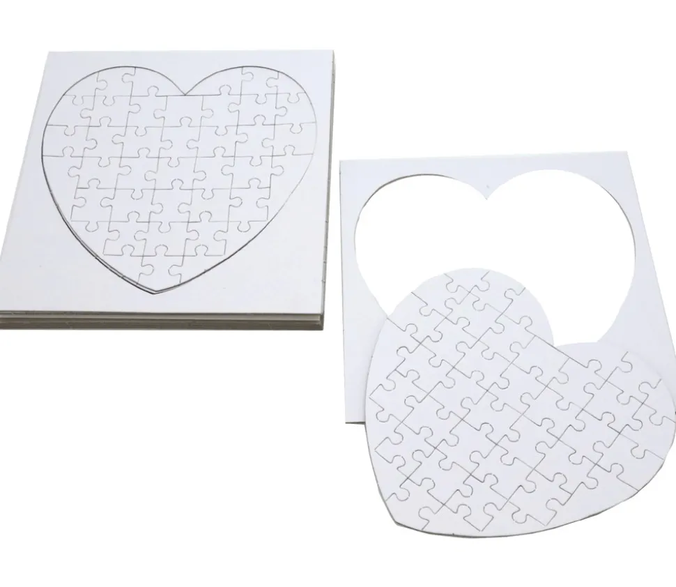 Lot de 10 puzzles neutres avec cadre contour en forme de cœur. Support en carton blanc à personnaliser comprenant 40 pièces et le cadre de contour.