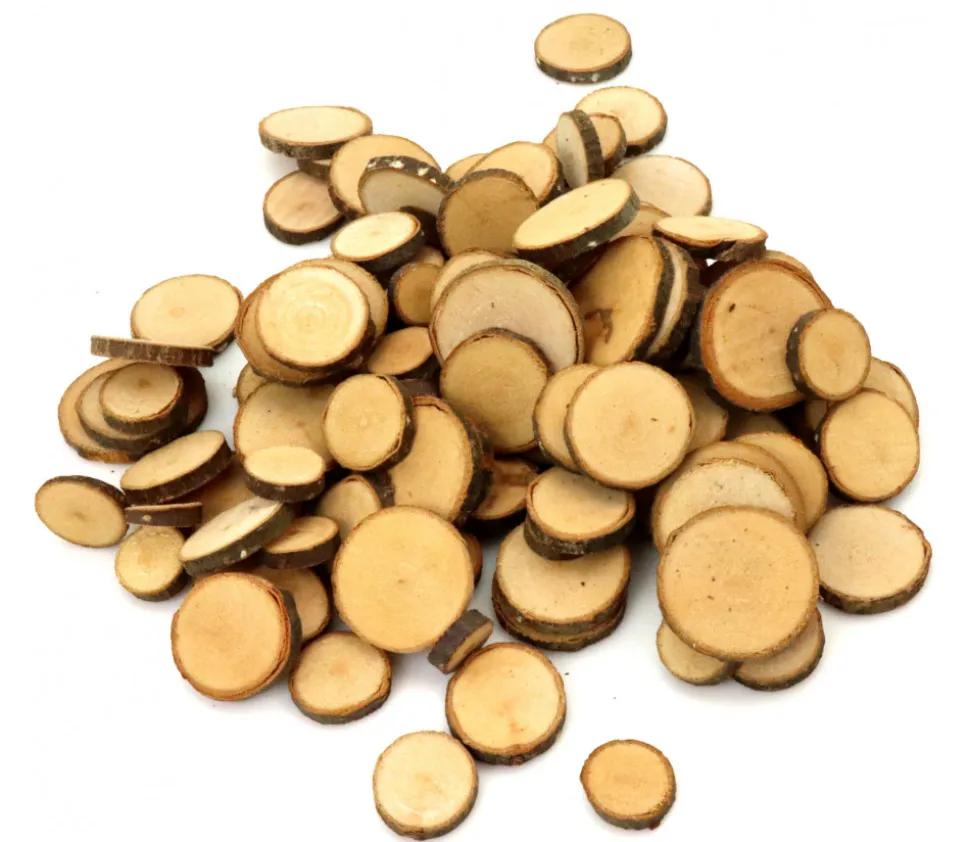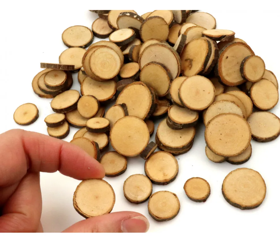 100 à 120 mini rondelles en bois avec écorce bois brut pour bricolage ou comptage de vos points. Diamètres des rondelles très variables entre 1 et 3 cm. Epaisseur d’environ 4 mm. Ces jetons sont des rondelles non traitées en vrac, vous pouvez donc avoir des ronds irréguliers ou des marques sur les faces comme le vrai bois…