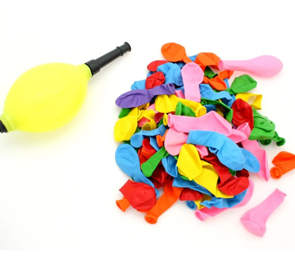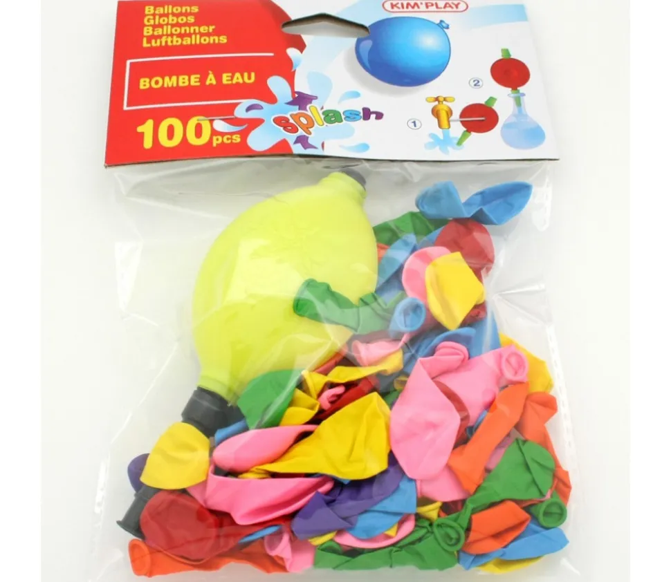 100 ballons bombe à eau de couleurs variés pour vos fêtes, animations ou jeux. Ballon bombe à eau pour jouer dehors l’été : fêtes, animations pour anniversaire des enfants. Jeux d’extérieur quand il fait chaud. Set de 100 ballons et un aide pour remplir les ballons. Et plaf, ça éclabousse.