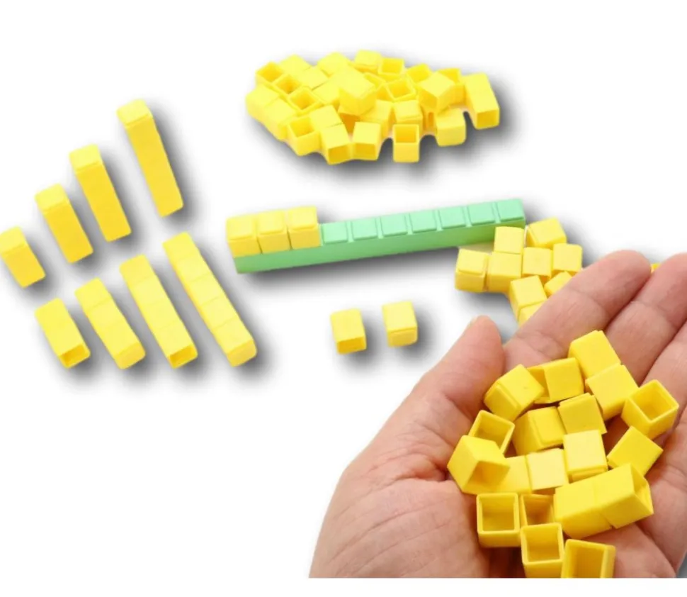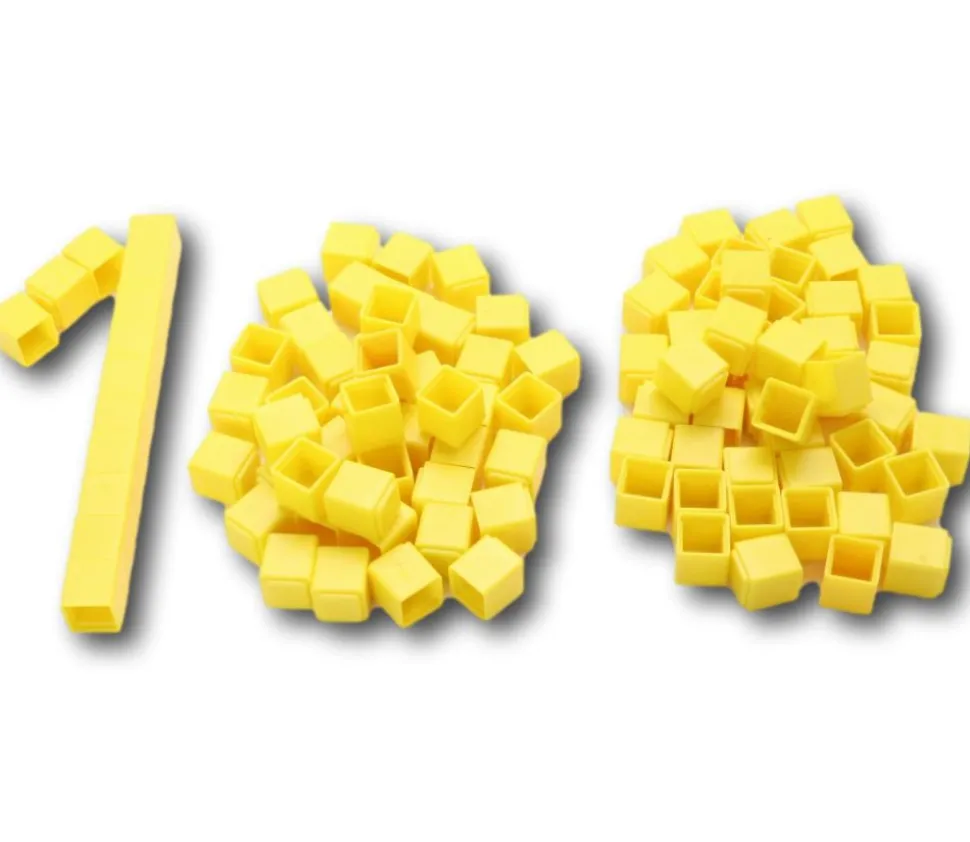 Découvrez ces cubes en Re-plastique de 1 cm, vendus par lot de 100, et qui sont conçus pour les jeux de base 10 en mathématiques.