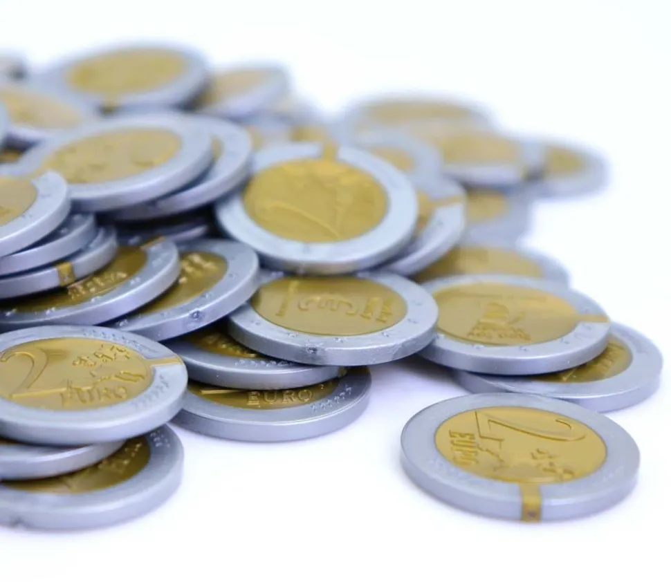 Set de 100 pièces en Re-plastique de 2 euros. Monnaie imitation euros pour jeux. Idéal pour jouer au jeu de la marchande ou à des jeux de société avec de l’argent.