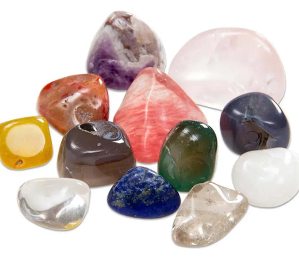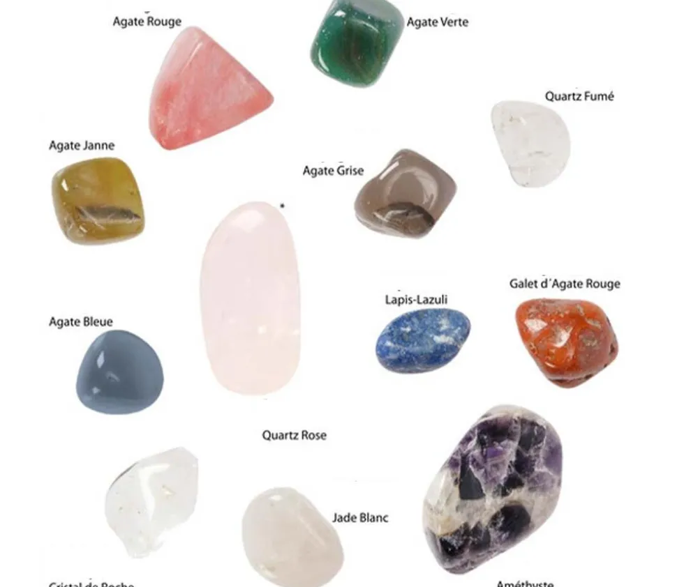 Le lot de galets pierres précieuses est composé de 12 pierres différentes : agate rouge, agate jaune, agate bleue, agate grise, agate verte, quartz fumé, quartz rose, lapis-lazuli, galet d’agate rouge, cristal de roche, jade blanc et améthyste.