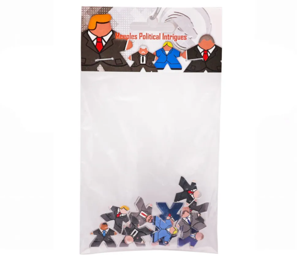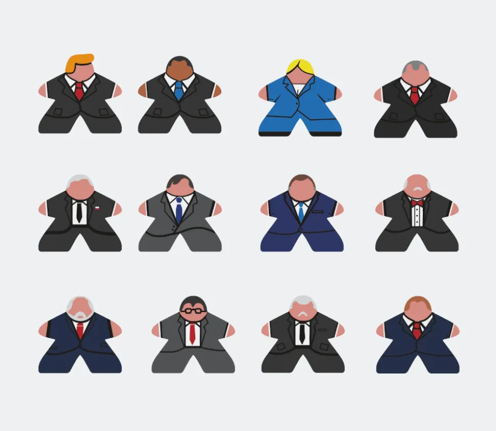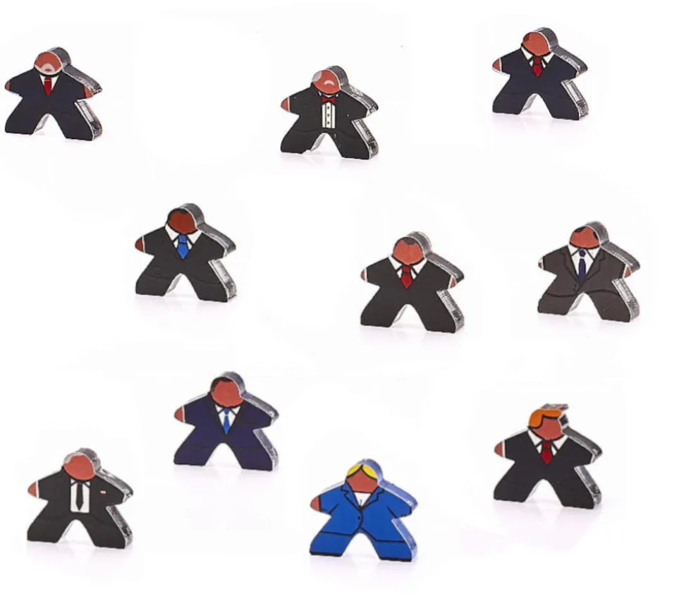 12 pions personnages en costume. 12 meeple political intrigues en plexiglas.