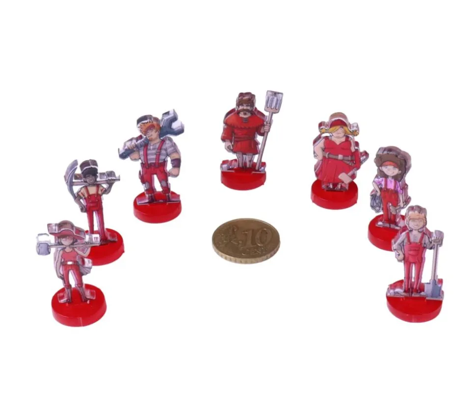 14 pions personnages bricoleurs en plexiglas pour jeux de société.