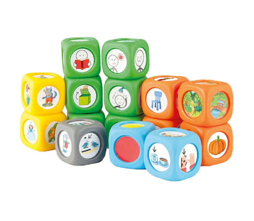 Set 15 grands dés à jouer colorés de 3.5 cm avec des illustrations différentes pour créer des histoires.