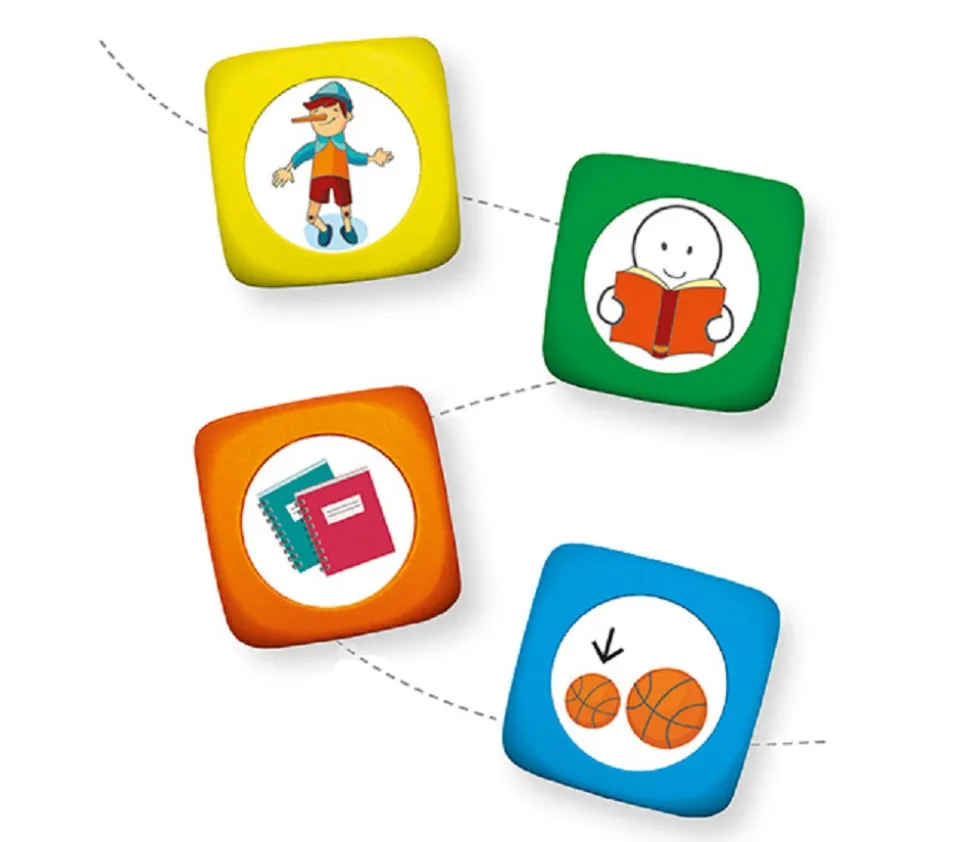 Jeu éducatif de dés avec images de contes classiques pour apprendre à construire des phrases. 90 pictogrammes de contes classiques comme Le lièvre et la tortue et Les Trois petits cochons, sont représentés sur les 15 dés.
