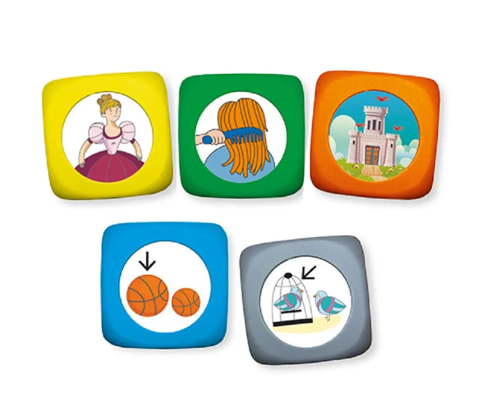 Jeu de dés original pour apprendre aux enfants, de manière ludique, la construction des phrases. 5 couleurs de dés différentes pour chaque classe grammaticale : sujet, verbe, nom, adjectif, adverbe. Les dés sont illustrés avec des personnages et pictogrammes de contes que les enfants connaissent bien : le Chat botté, Cendrillon, Pinocchio…