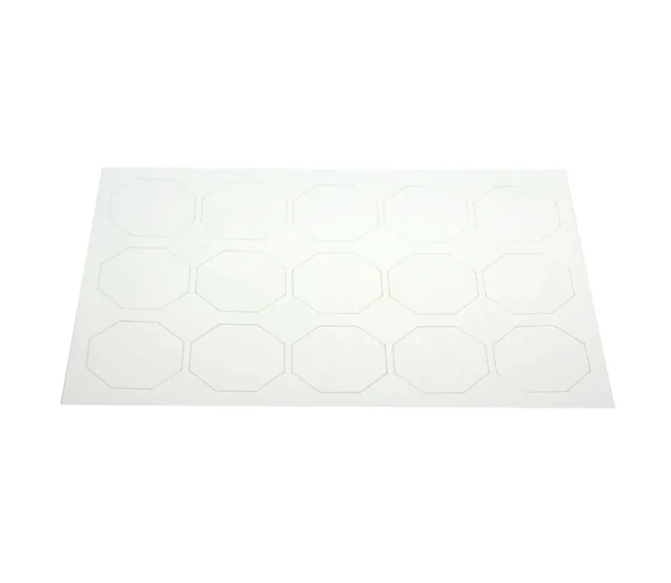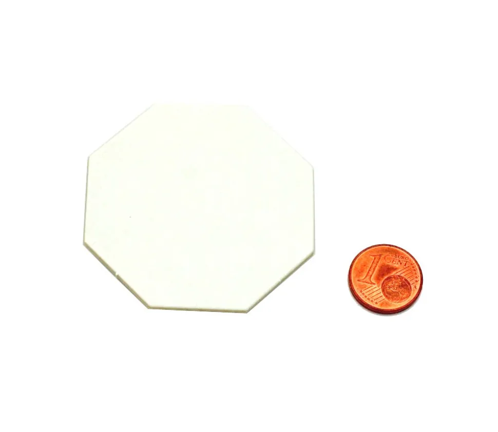 Tuiles cartonnées blanches recto-verso avec un diamètre de 5 cm. Forme octogonale. Epaisseur de 1 mm.
