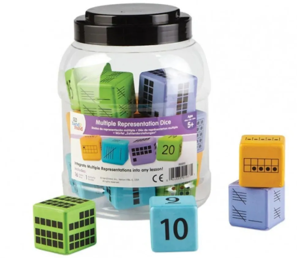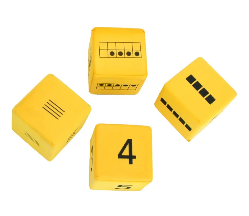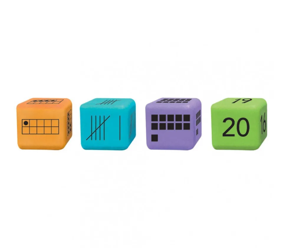 16 dés en mousse de 4.5 cm représentant les nombres de 0 à 20. 4 Représentations différentes : chiffres, barres, carrés, points dans un tableau de 10 pour tous les nombres de 1 à 20.