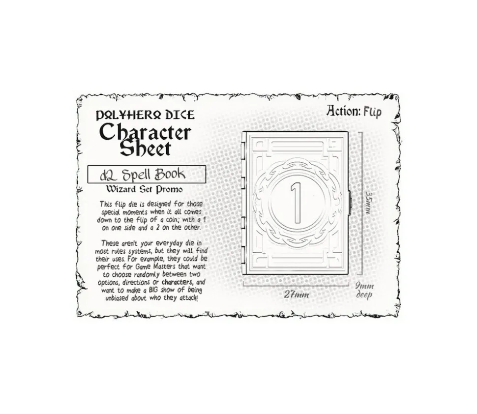 2 Dés originaux multifaces 20 faces et 2 faces. Chapeau toupie pour ce dé 20 faces à faire tourner et Livre grimoire pour le dé 2 faces comme un pile ou face