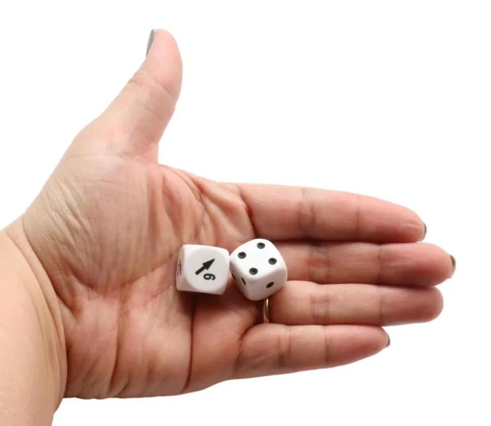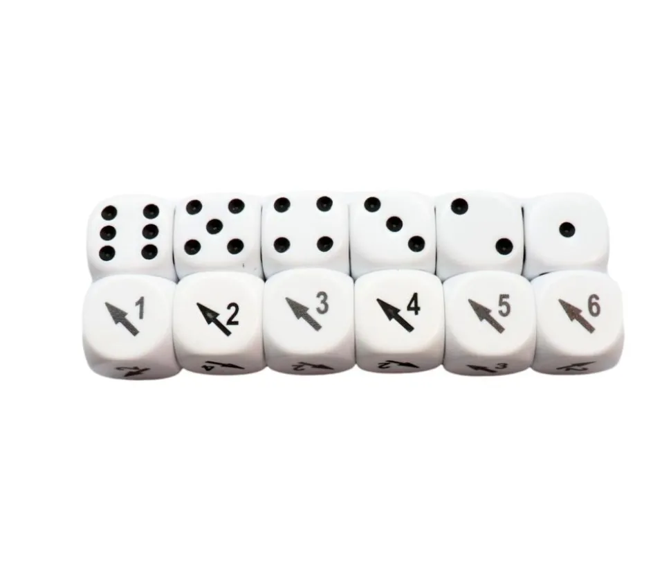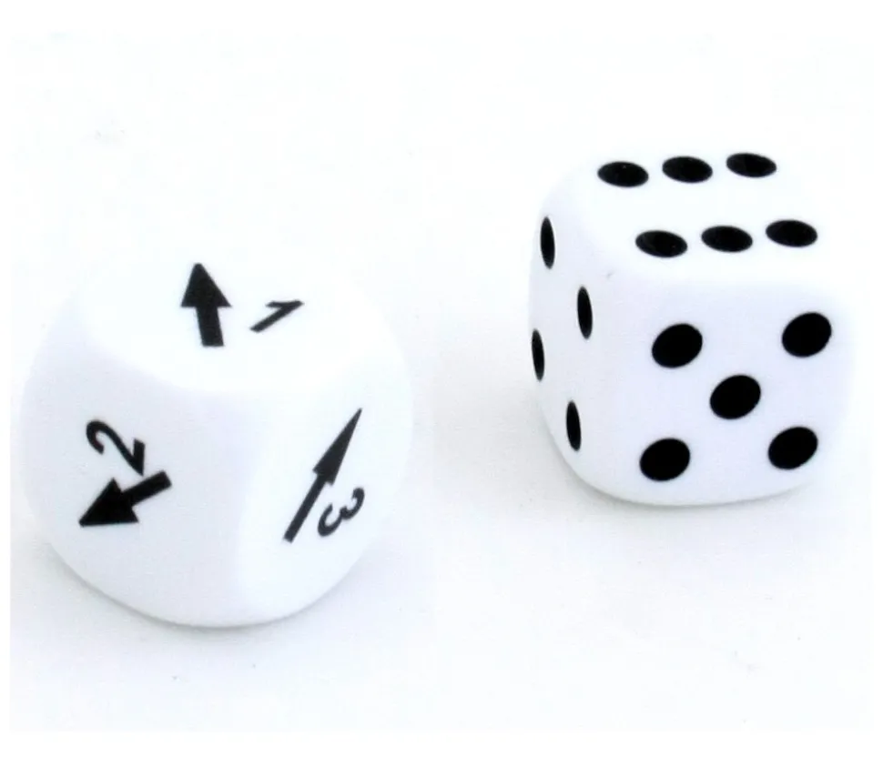 2 dés à jouer 16 mm blancs : 1 dé de jeu standard avec points de 1 à 6 et 1 autre dé avec des flèches de direction pour indiquer le sens du déplacement. Dé orientation intéressant. Un dé pour indiquer où doit avancer le personnage (gauche, droite) et de combien de cases. Accessoire jeu de société, jeu de parcours et jeu de rôle. Dé en plastique gravé. WIR2 – dés orientation randomizer.