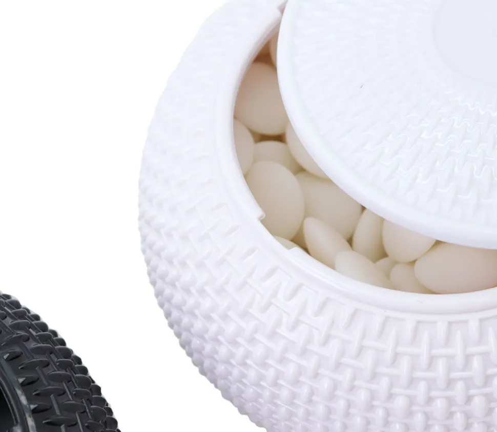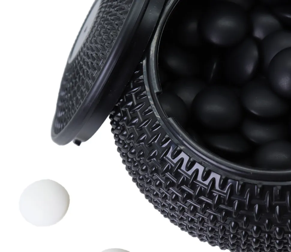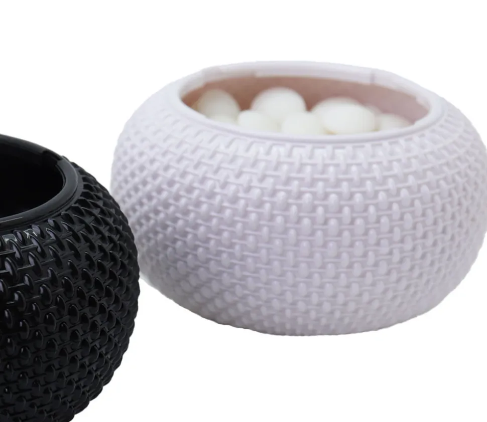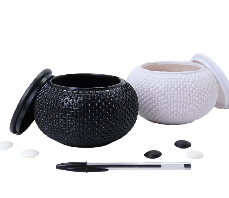 Le set de deux jarres et pions pour jeux de go bi-convexes est composé de deux bols en plastique et de plus ou moins 180 pierres blanches et plus ou moins 180 pierres noires.