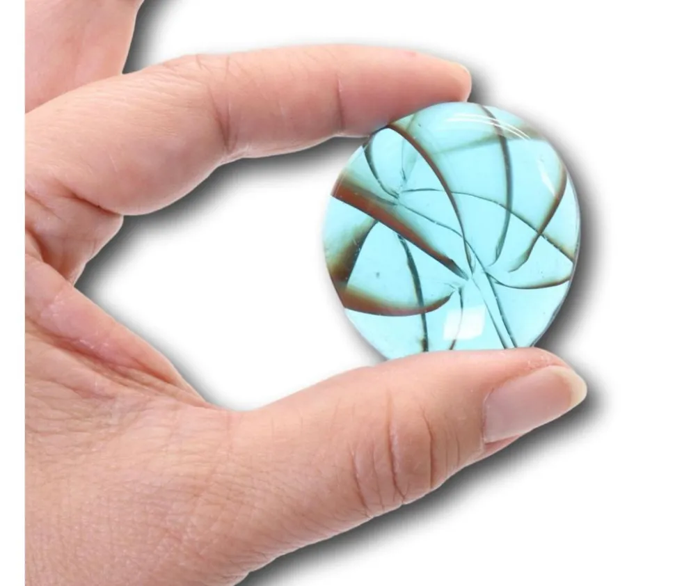 Lot d’une vingtaine de galets arrondis plats en verre de différents couleurs parmi marron, turquoise, bleu, blanc translucide…