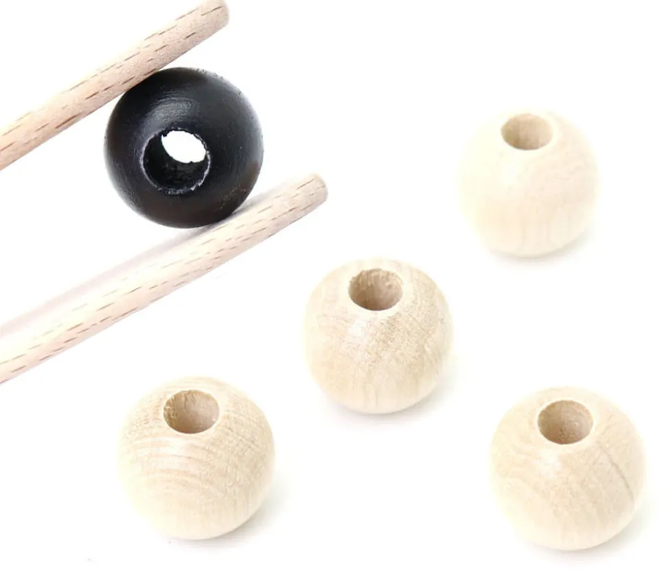 20 perles rondes en bois noires, blanches et naturelles de 2 cm de diamètre avec perçage de 0.7 cm.