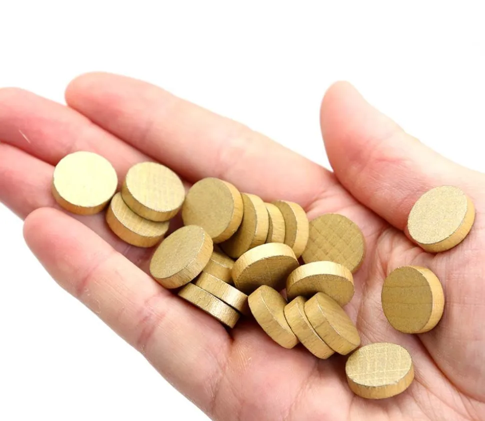 Pions ronds en bois de 1.5 cm de diamètre et hauteur 0.4 cm. Jetons en bois teinté de couleur doré.