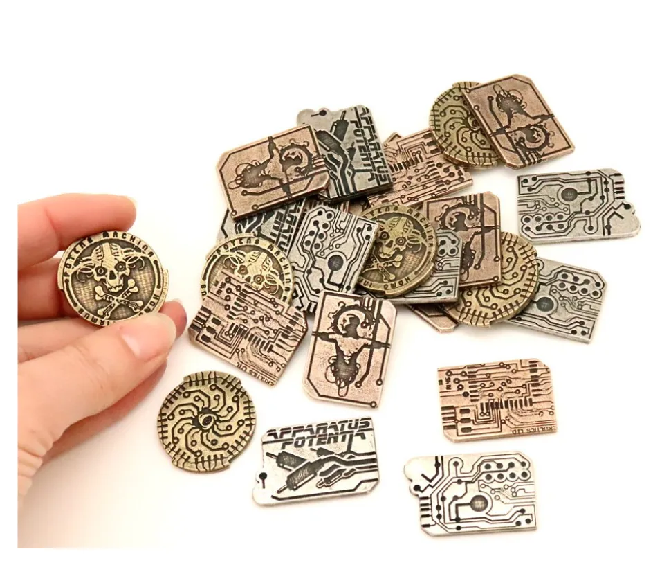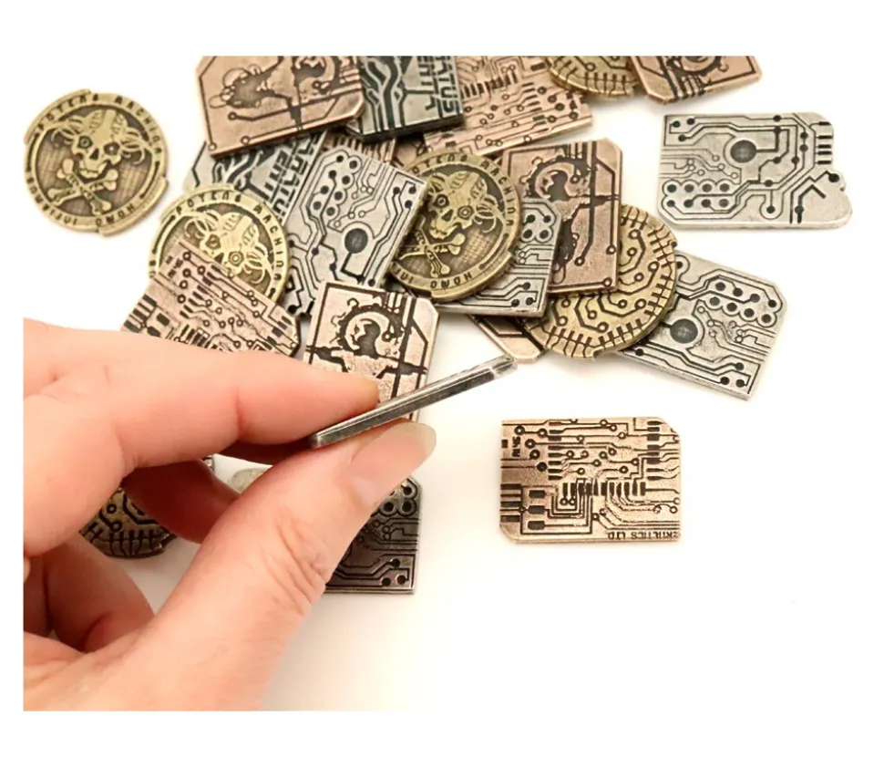 Pièces Cyberpunk de jeu en métal fabricant Drawlab pour jeux de société, jeux de rôle. Pièce métallique gravage sur les 2 faces. Pièces jeux super belle imitation.