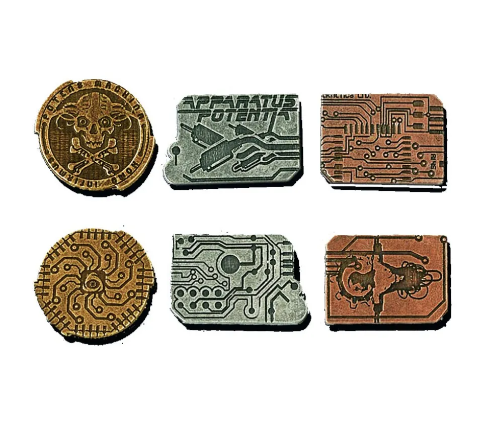 20 Pièces en métal pour jeu avec des motifs Cyberpunk. Gravées des 2 côtés. 3 Pièces différentes avec des gravures des 2 côtés.
