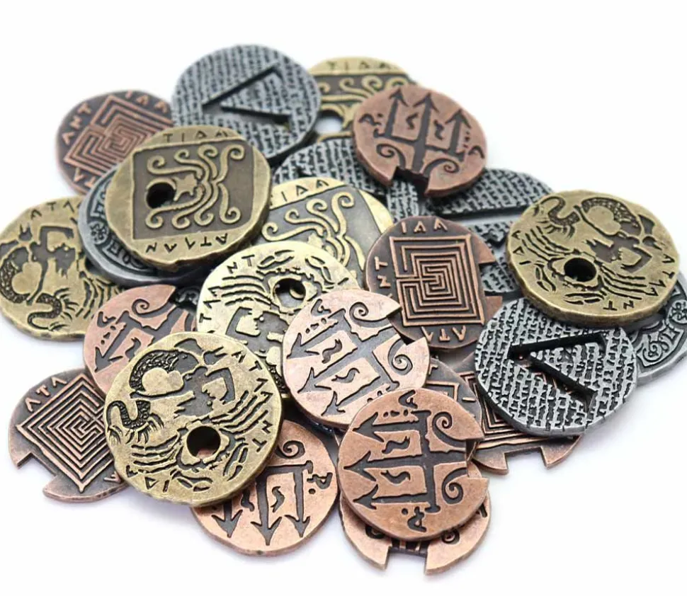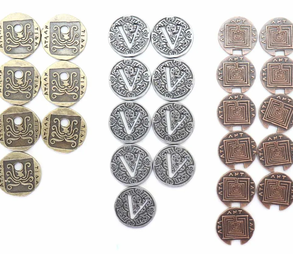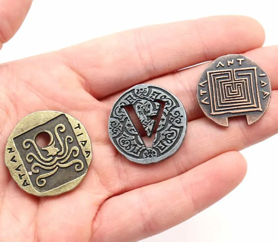 20 Pièces en métal Atlantis pour jeu avec des motifs de sur le thème de la légende de l’Atlantis. Le mythe de la cité perdue qui a inspiré l’humanité depuis de 2500 ans. Plongez dans les profondeurs de la mer et tentez de percer les mystères de l’Atlantis.