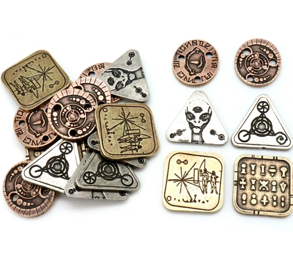 20 Pièces en métal pour jeu sur le thème des aliens. Symbolique mystérieuse des petits hommes verts…