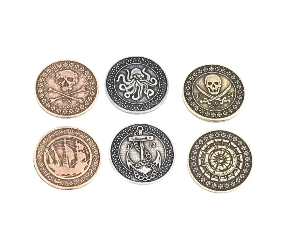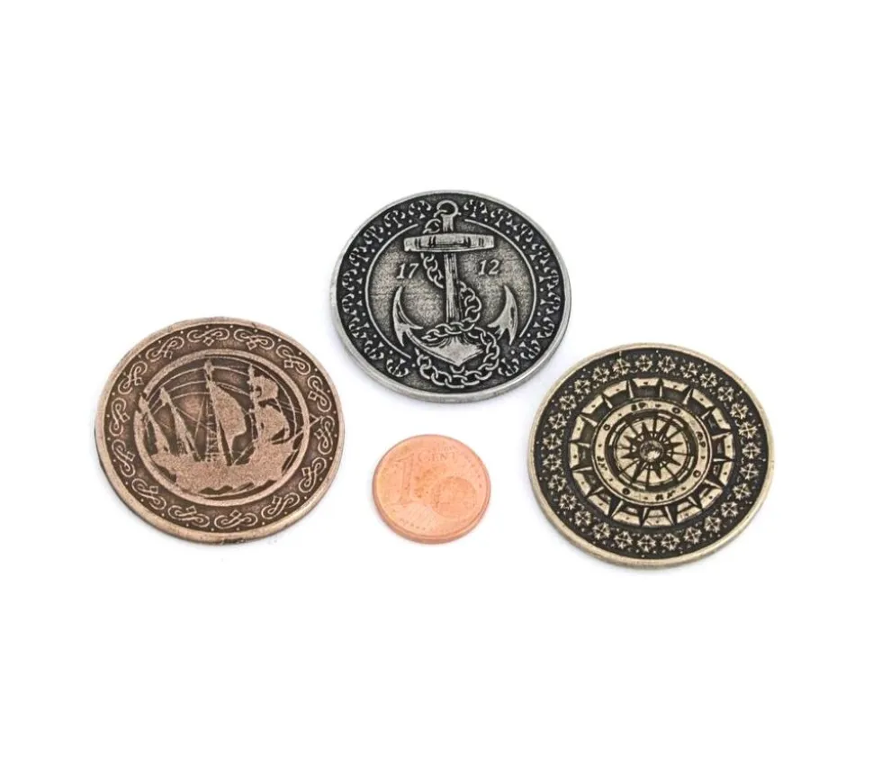 20 Pièces pirates en métal pour jeu de 3.5 cm de diamètre. Gravées des 2 côtés. 3 Pièces différentes pirates (bateau, tête de mort, ancre, boussole..). Très belles pièces pour vos jeux de société.