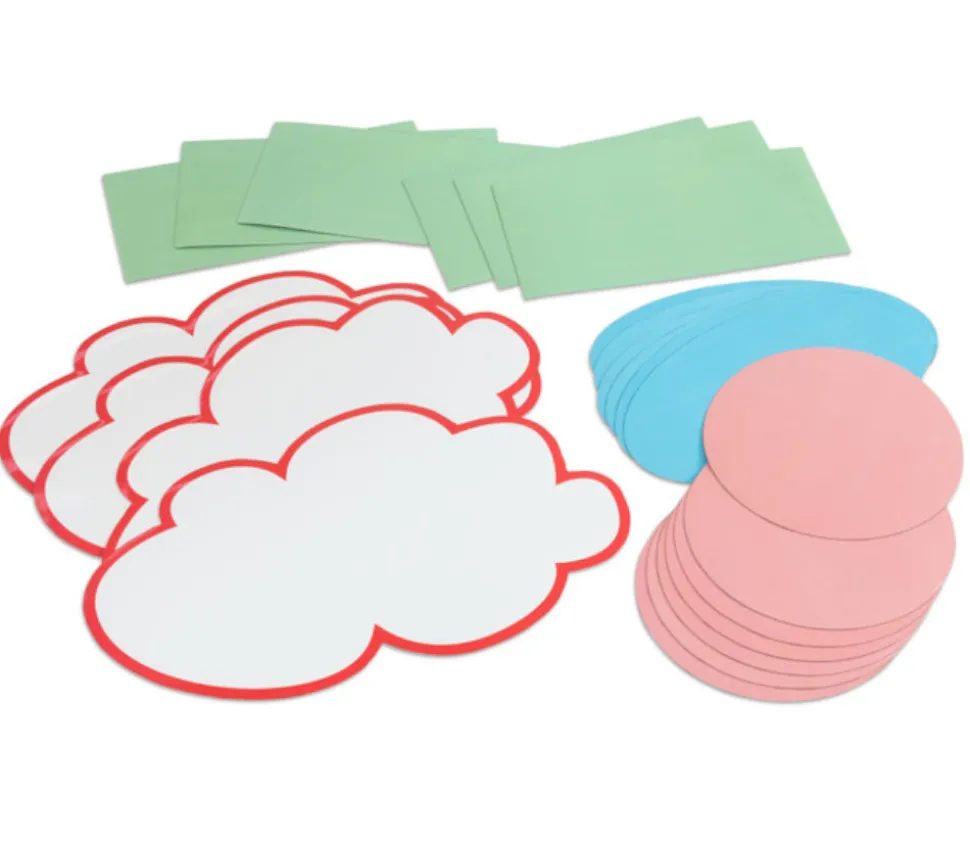 22 Magnets effaçables aimantés pour créer vos propres magnets personnalisés. Supports sur lesquels vous pouvez écrire et dessiner avec des feutres effaçables à sec (de type velleda) et effacer ensuite. Ces cartes magnétiques tiennent sur de nombreuses surfaces comme les tableaux pour faire des présentations. 6 rectangles 20 x 10 cm, 6 cercles 14 cm, 6 ovales 20 x 11 cm et 4 nuages 28.3 x 17.6 cm.