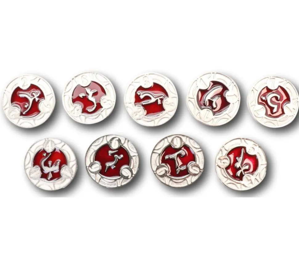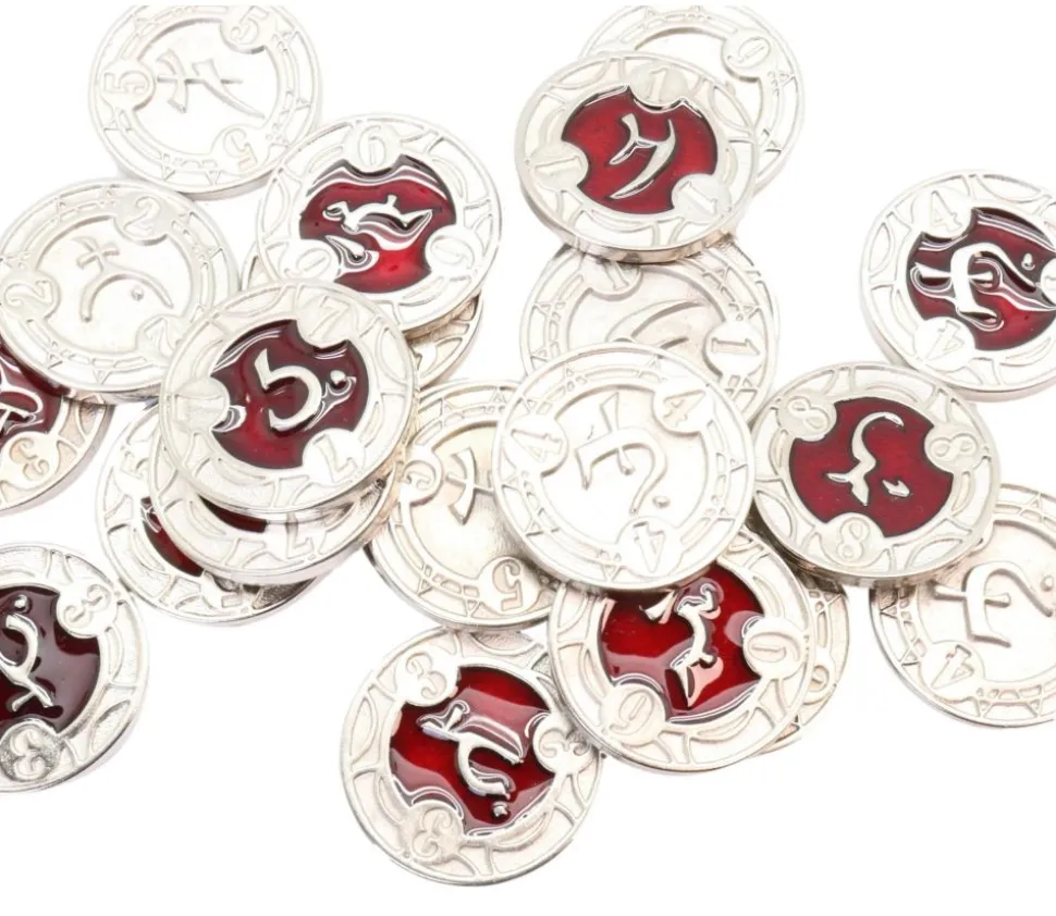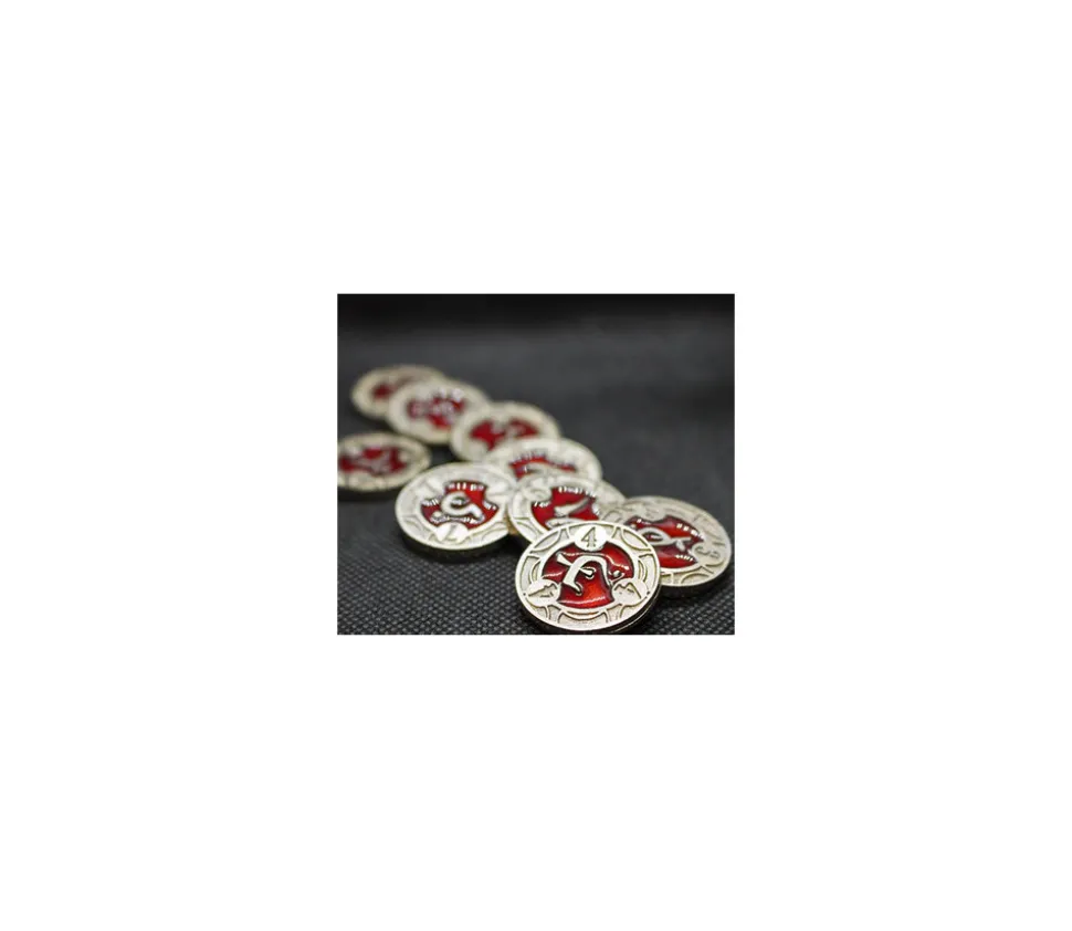 Des pièces magiques mixant le métal gravé et de l’émail rouge. 22 Pièces en métal pour jeu de 27 mm de diamètre et 3 mm d’épaisseur. Ce set contient 22 pièces métalliques dont 9 différentes. Ce superbe set vous permettra de suivre de la plus élégante des manières vos sortilèges dans les jeux RPG les plus populaires. Gravures différentes des deux côtés : une face gravée avec intégration de rouge et une face gravage seulement. Utiliser la face colorée pour le côté actif du sort et le dos de coin pour garder une trace des sorts déjà utilisés. Cela vous permet un super suivi de vos sorts dans vos jeux de rôle. Legendary metal coins Spell RPG tokens. Un mélange vraiment unique.