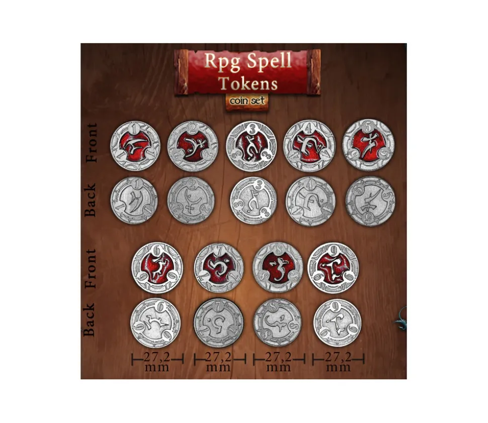 Ces pièces pour vos jeux sont en métal gravé sur les deux faces. Thème RPG Spell Tokens. Fabricant Drawlab.