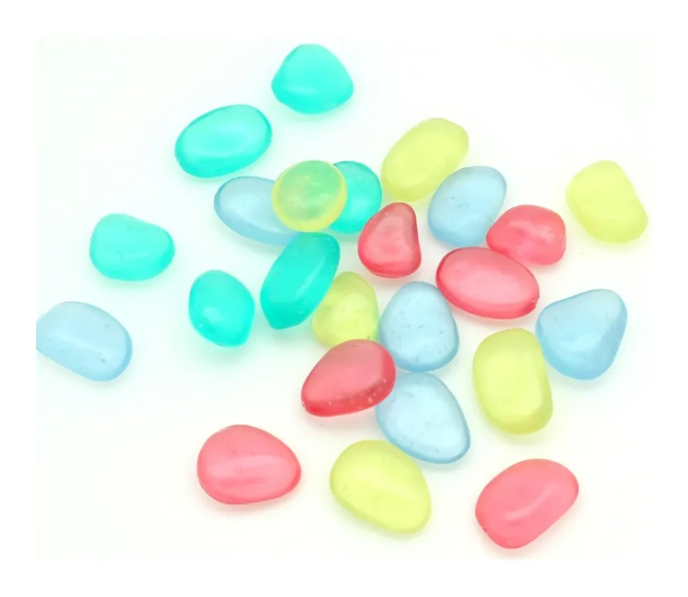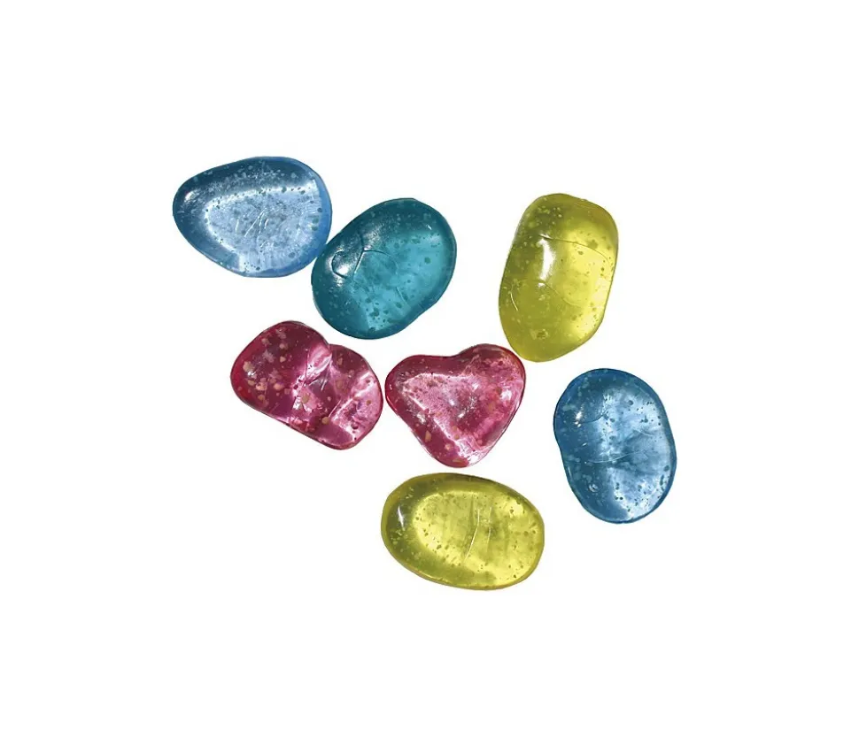 24 galets avec paillettes lumineuses à l’intérieur. Galets jetons fluorescents, intéressant pour des jeux de nuit. Diamètre des pièces entre 8 mm et 1 cm. Les pièces sont de taille variées. 24 pierres multicolores livrées dans un tube.