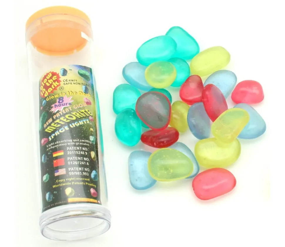 Lot de 24 galets météorites qui brillent dans la nuit. Sympa pour faire des jeux de piste dans la nuit ou des jeux de société. Pépites fluorescentes qui brillent dans le noir après une exposition à la lumière.