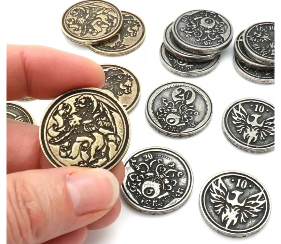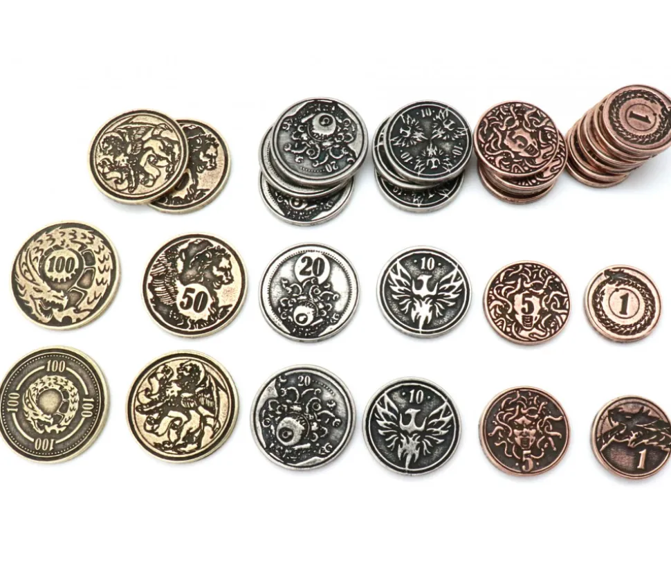 Des pièces de jeux métalliques avec le gravage des chiffres et des animaux « créatures fantastiques ».