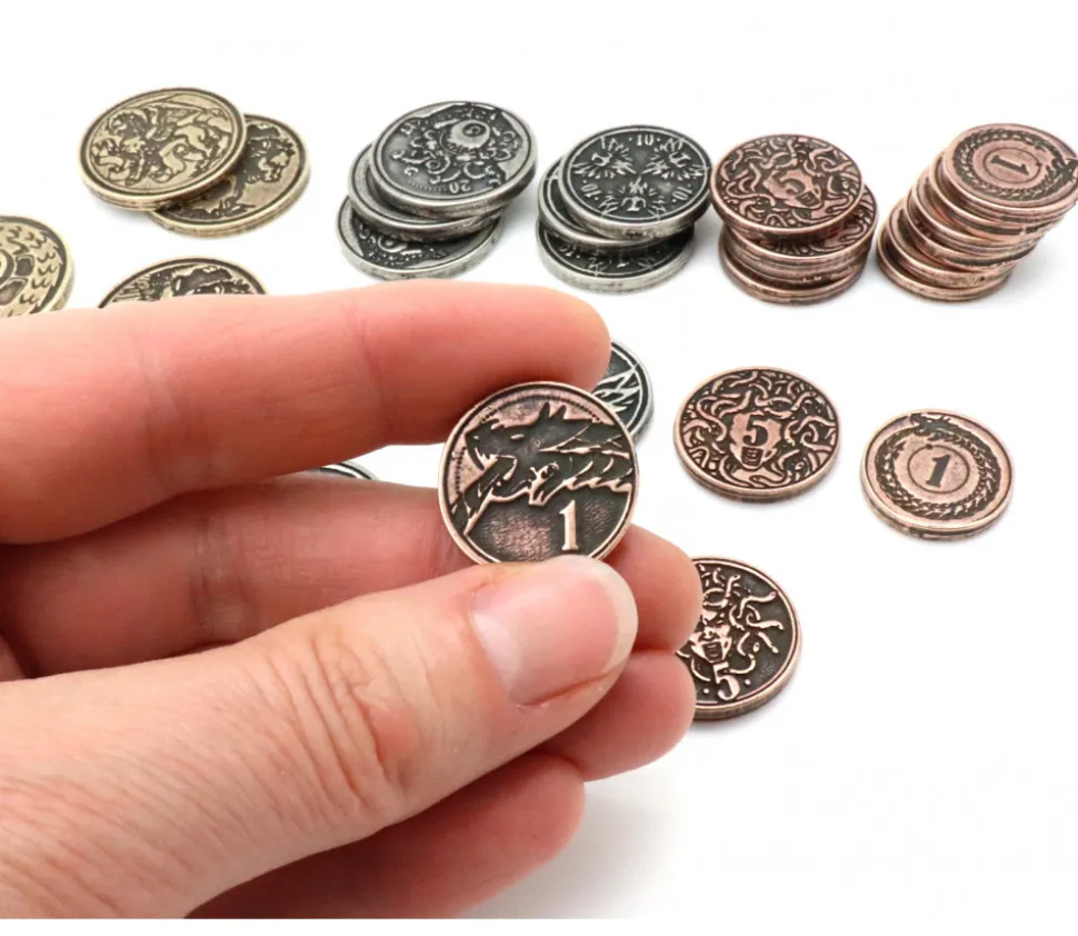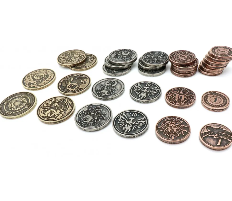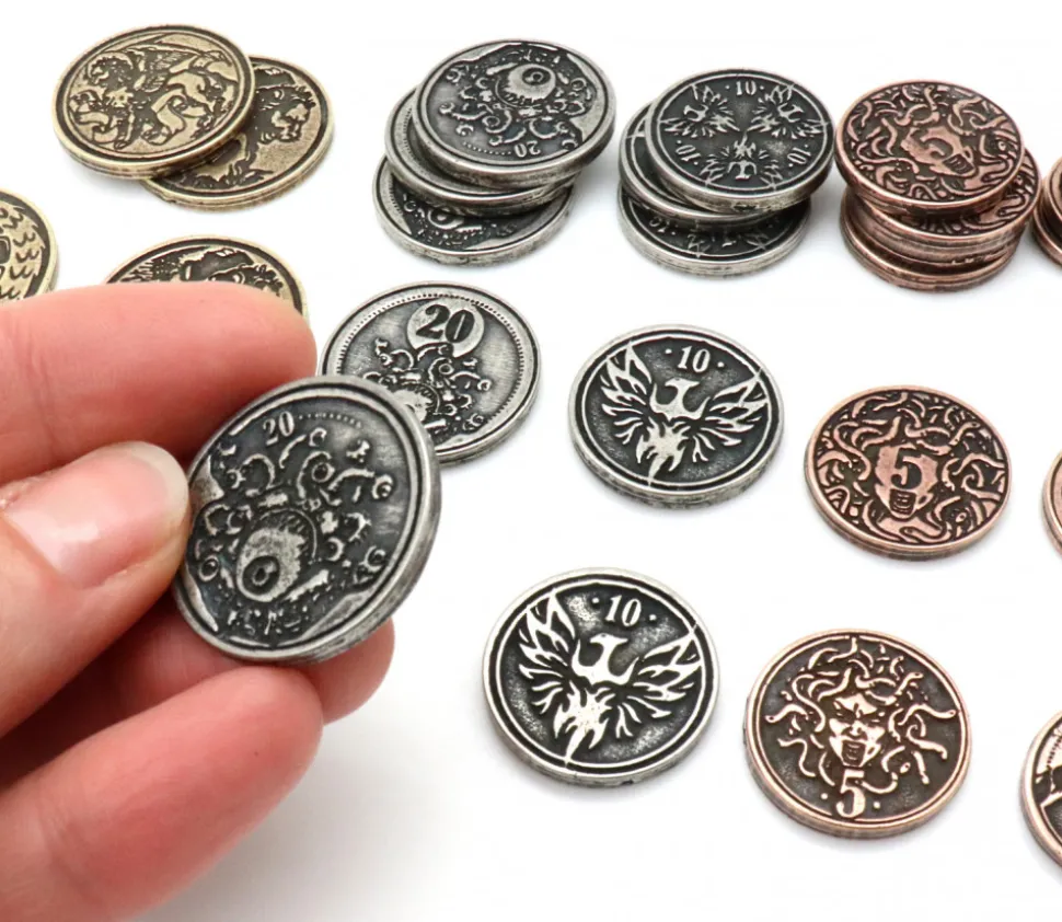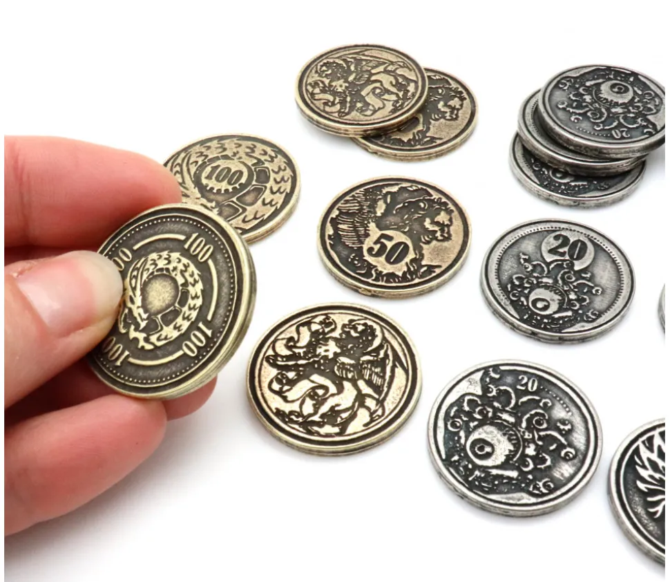 3 teintes de pièces en fonction de la valeur des points : 1 5 10 2 50 et 100. Gravures différentes des deux côtés. Set de 30 Legendary metal coins CREATURE UNIT.