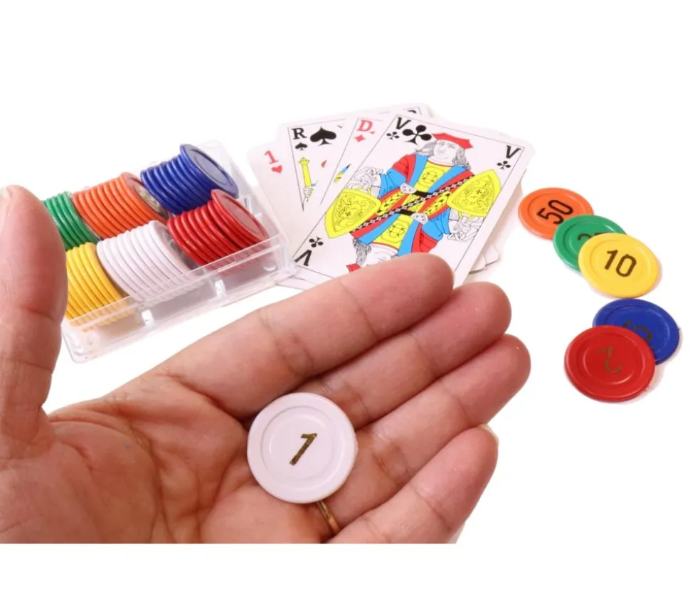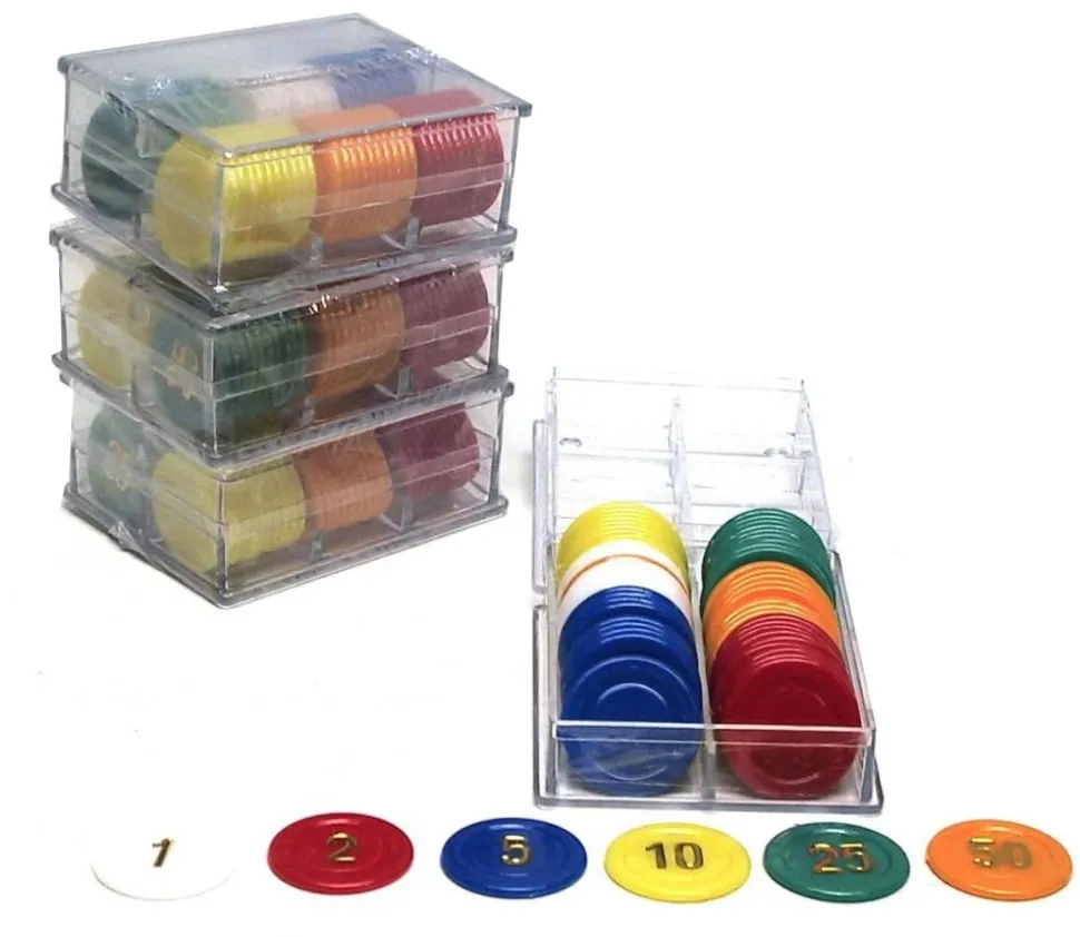 Lot de 240 pions numérotés pour jeu de mise, jeux de cartes ou roulette. Jetons colorés en plastique avec chiffres 1, 2, 5, 10, 25 et 50. Pion en 6 couleurs de 2,5 cm de diamètre dans 4 petites boites.