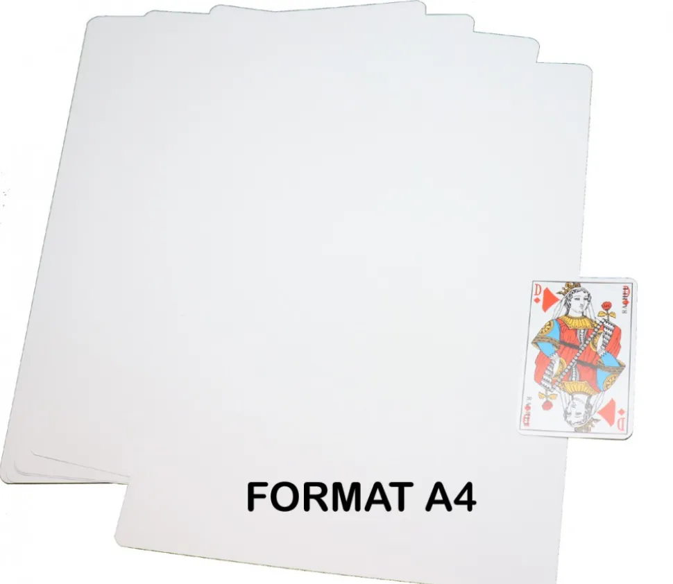 Ces cartes vierges passent très bien à l’imprimante ou copieur laser par exemple. C’est un format A4 qui vous permettra de faire des cartes à jouer géantes, vos propres cartons de jeux de société ou des supports pour vos exercices.