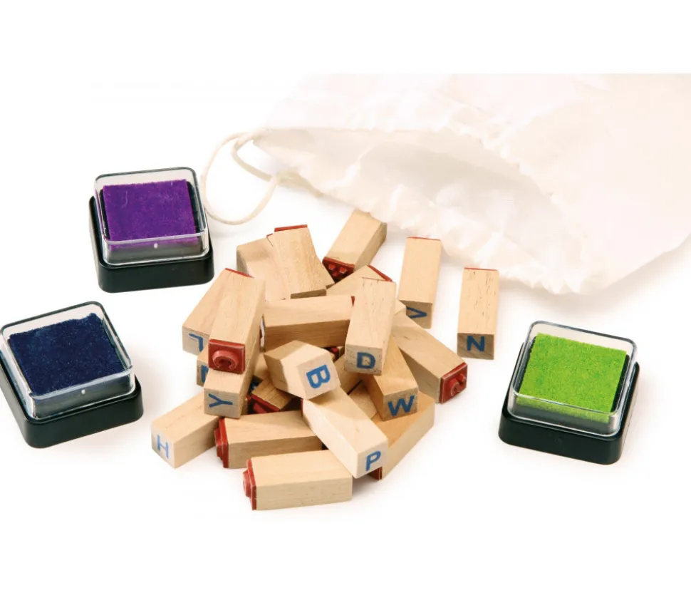 Set de 26 tampons avec les lettres de l’alphabet et 3 tampons encreurs colorés.