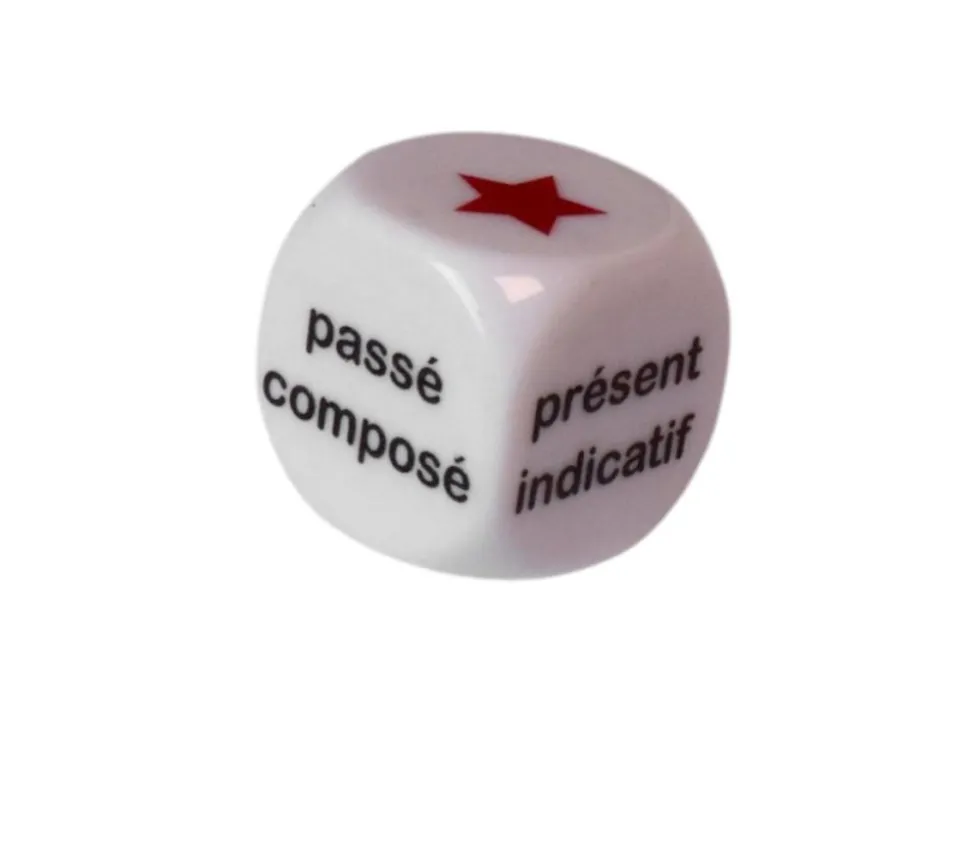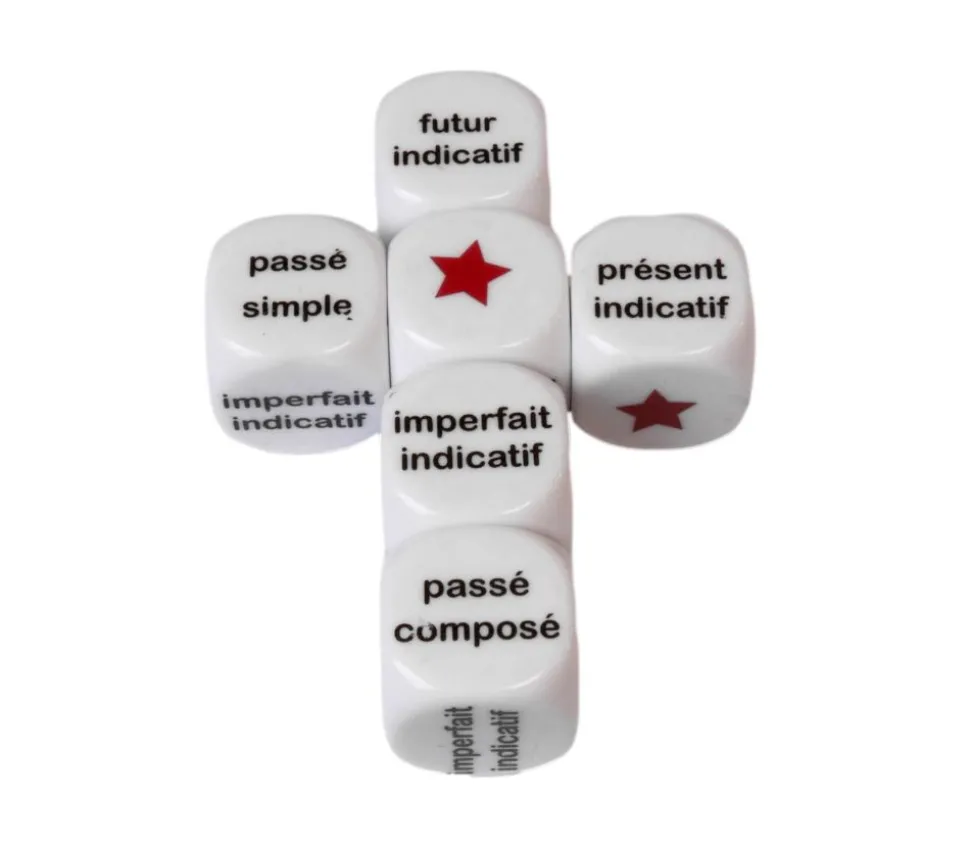 Dé spécial avec les mots suivants imprimés sur les faces : présent indicatif, passé simple, futur indicatif, imperfait indicatif (avec une faute sur le mot imparfait écrit avec un e au lieu d’un a!), passé composé et 1 face joker