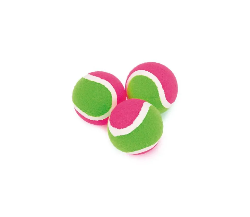 Lot de 3 balles de tennis auto agrippantes pour jeux. 3 balles à lancer qui se collent sur toutes les cibles avec velcro. Balles de remplacement vendues par lot de 3 balles. pour vos jeux de lancer avec scratch. Diamètre de la balle : 6.3 cm. Accessoires Jouet pour sport d’extérieur. Un jeu super pour apprendre à mieux lancer. Balles roses et vertes vendues par lot de 3 (sans les supports cibles).