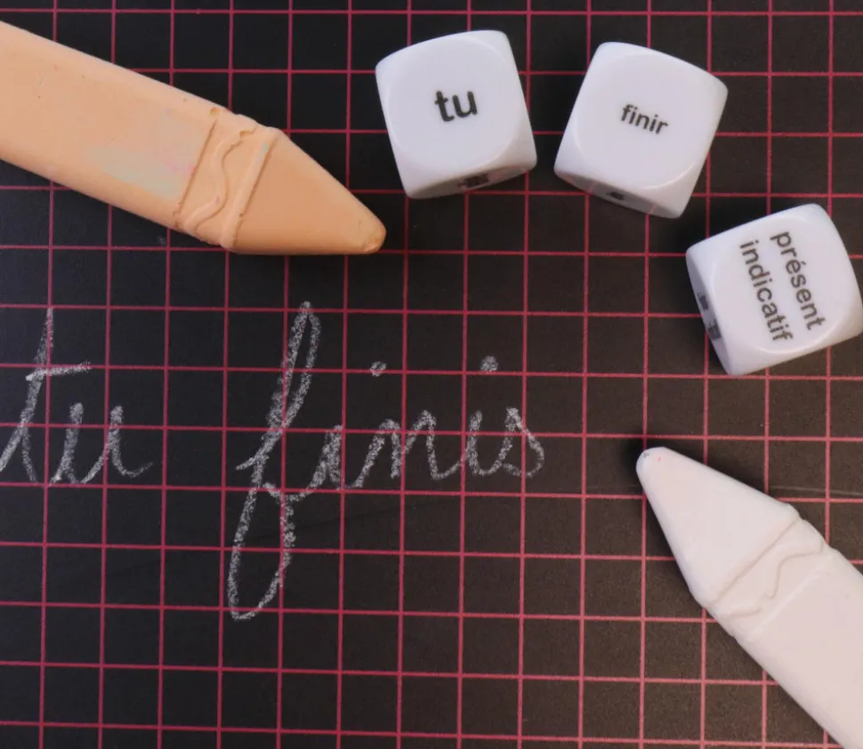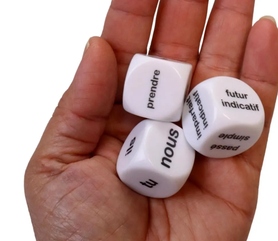 Set de dés à jouer pour réviser ou apprendre les conjugaisons avec les enfants.