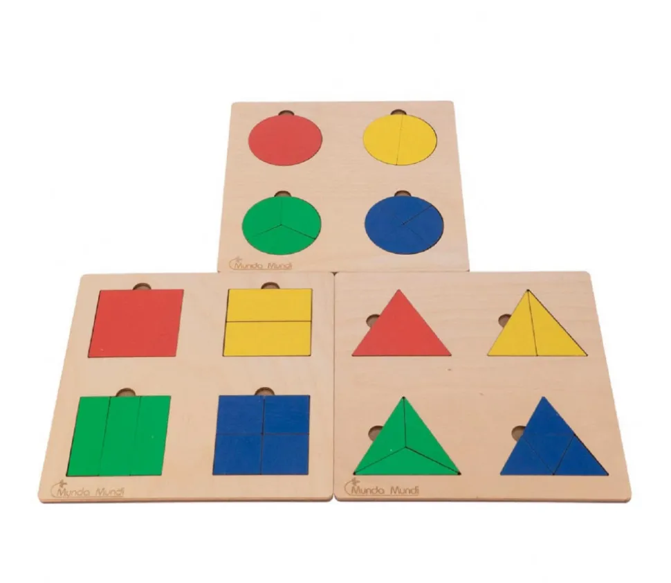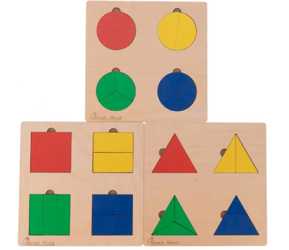 Set de 3 plateaux Puzzles en bois sur les fractions. Jeu de décomposition des premières fractions, aide à la compréhension mathématiques pour les enfants.
