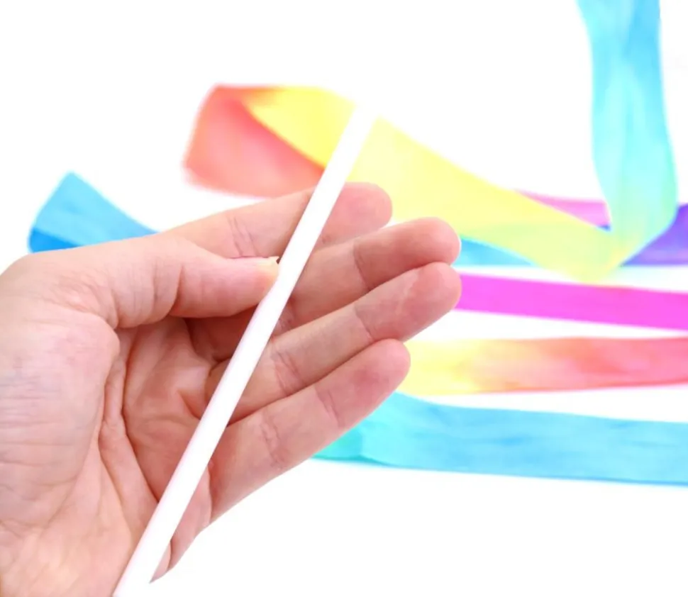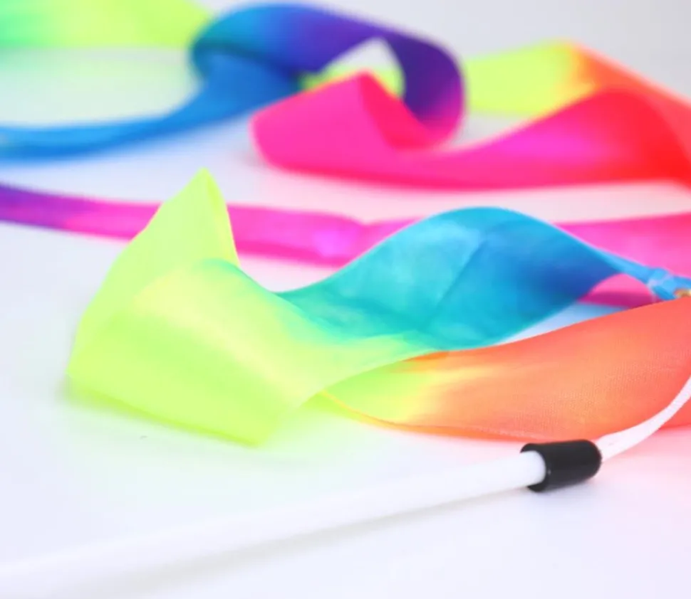 Lot de 3 rubans arc en ciel multicolore de 2 mètres de long avec baguette plastique de 41 cm. Grand ruban à faire tourbillonner dans les airs. Le mouvement est amusant. Matériel pour faire des exercices de danse, relaxation, gymnastique rythmique. Coordination main oeil. Grand ruban multicolore de 200 cm attachée à la baguette en plastique.