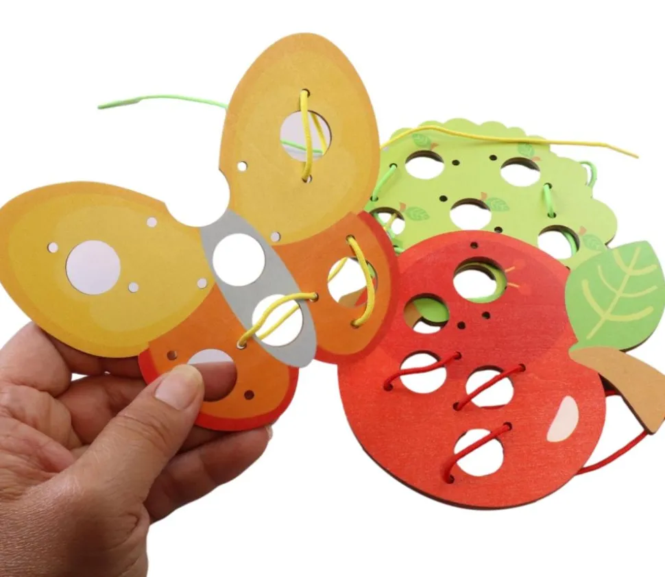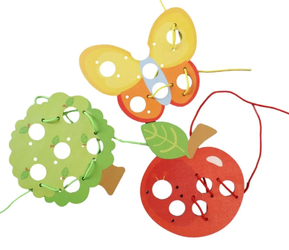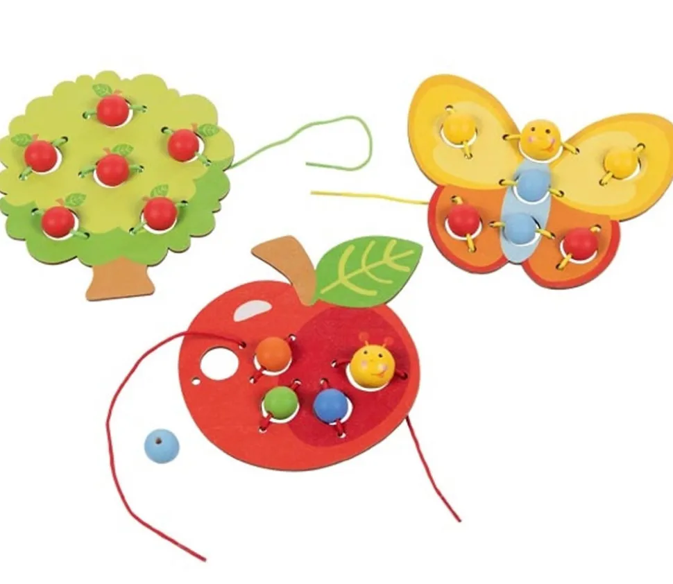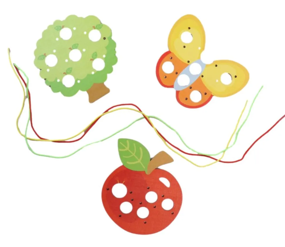Jeu de Laçage pour enfants en bois avec 3 tableaux : pomme, pommier et papillon.