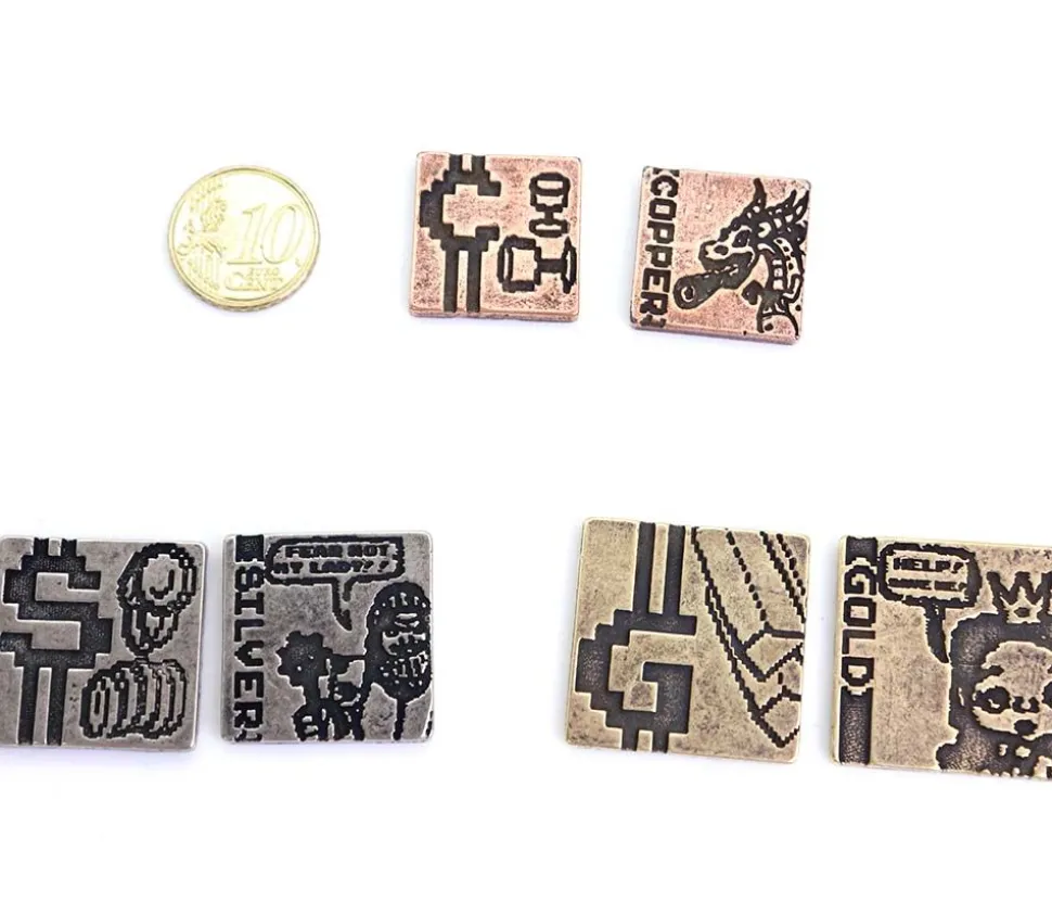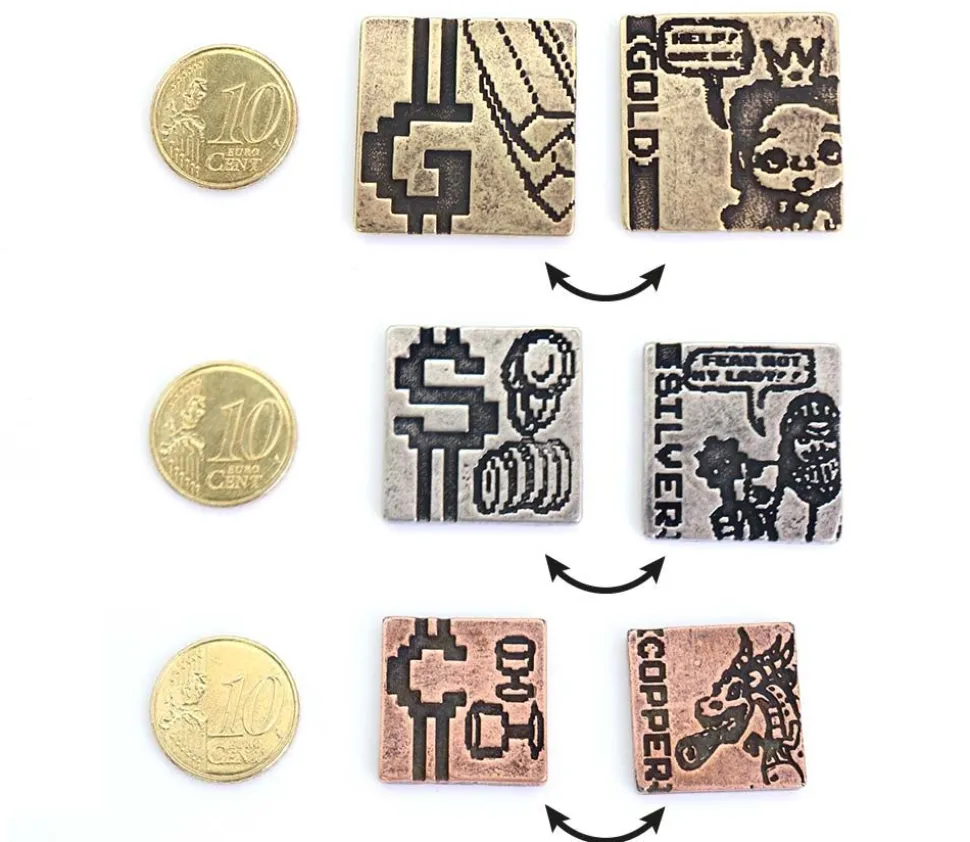 3 Pièces différentes de forme carrée avec des gravures des 2 côtés. Très belles pièces historiques pour vos jeux de société. Finition vieillie usée. 3 pièces couleur or gravure princesse au recto lingot d’or au verso, 8 pièces couleur argent avec chevalier au recto pièces d’argent au verso, 19 pièces bronze dragon sur le recto et graal – calice au verso.