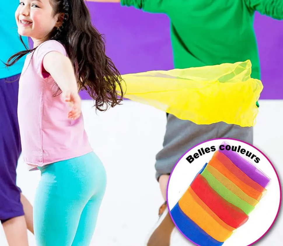 Vos chorégraphies seront lumineuses grâce à cet accessoire de légèreté et de grâce , l’apprentissage de la jonglerie sera plus fun et l’effet arc en ciel des foulards en l’air ravira les spectateurs. Les exercices de motricité pour les personnes affaiblies physiquement seront plus attrayants grâce à ces foulards et leur donnera le goût de la rééducation