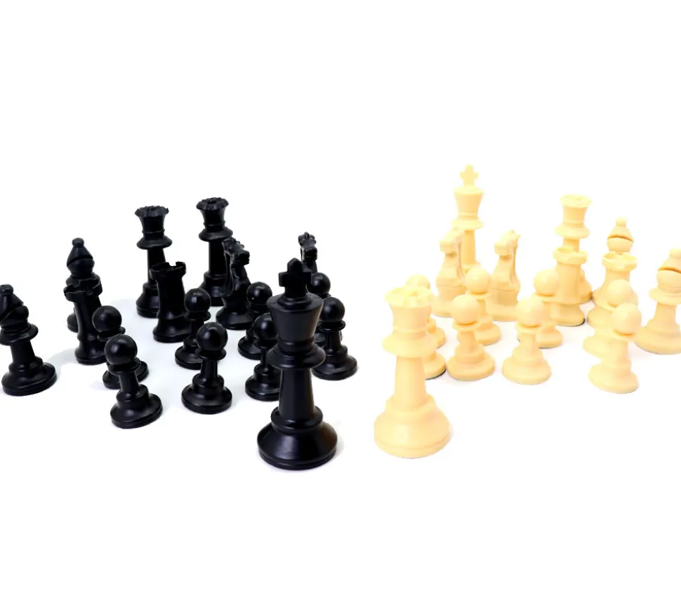 Pièces d’échecs en plastique avec roi de 77 mm de haut. 32 pions d’échec en noir et blanc-crème idéale pour vos parties d’échec.