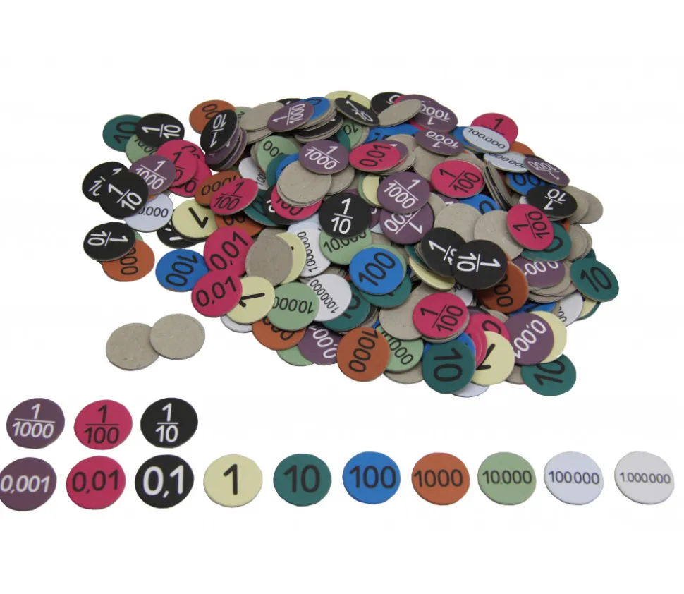 352 jetons numérotés de 0.001 à 1000000 et fractions 1/10, 1/100 et 1/1000. Jetons en carton recyclé de 2.5 cm pour exercices de mathématiques. Idéal pour jeux de chiffres. Impression recto seulement.